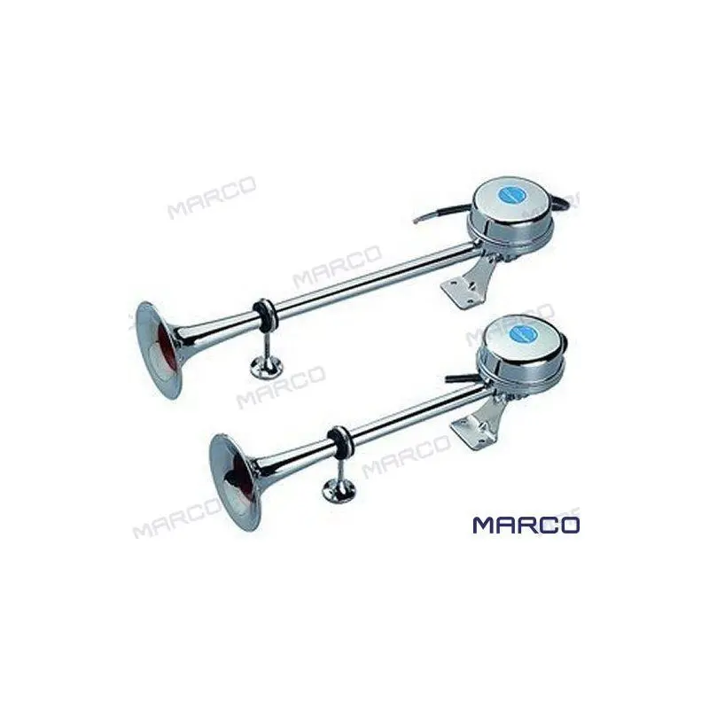 The dual trumpet electric horn by Marco is designed to provide maximum loudness and acoustic visibility onboard. Its construction in polished chrome brass and corrosion-resistant materials makes it ideal for demanding marine life.