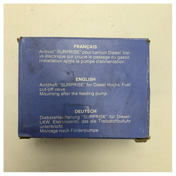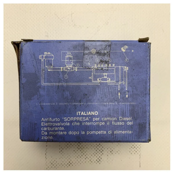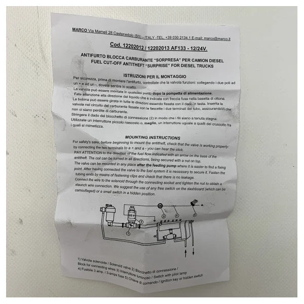 Anti-theft device for trucks, boats, and yachts, which stops the fuel flow using an electrovalve activated by a hidden switch. Passage hole solenoid valve 4.5 mm. Equipped with electrical cable connector and mounting brackets.