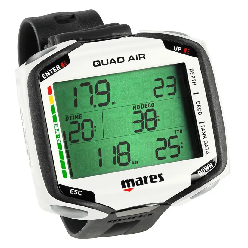 The Mares Quad Air Dive Computer features a rectangular LCD screen that is 15% larger than the Nemo Wide, excellent contrast, and large characters, making it very easy to read the ascent rate in m/min and the underwater dive time. Furthermore, the three-line layout includes all relevant data, including tank pressure for quick and simple reading.