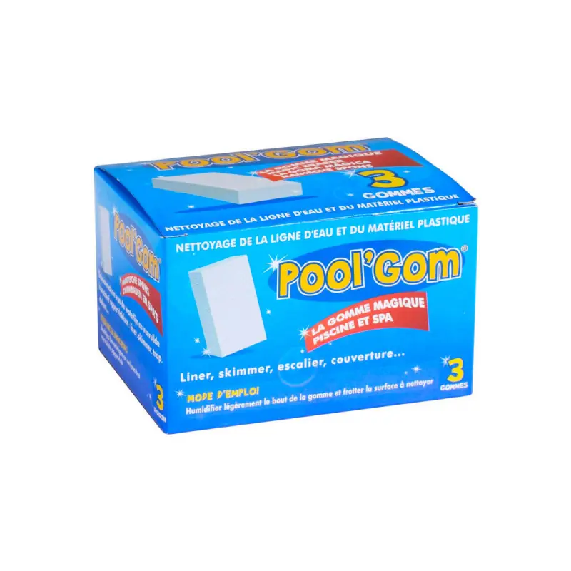 With thesePool’Gom MAREVA magic anti-stain erasers, clean your waterline, liner, steps, skimmer, and all plastic equipment in a flash. Wet the eraser and rub the surface to be cleaned: in one motion, all dirt will be removed. Working by micro-abrasion, this eraser is a patented plastic foam that hardens on the surface when moistened. This hardened part remains flexible and malleable to ensure easy use and effective cleaning in the smallest corners. Without any addition of detergents or chemical substances, these erasers allow you to eliminate all traces and stains embedded in plastic materials by erasing.