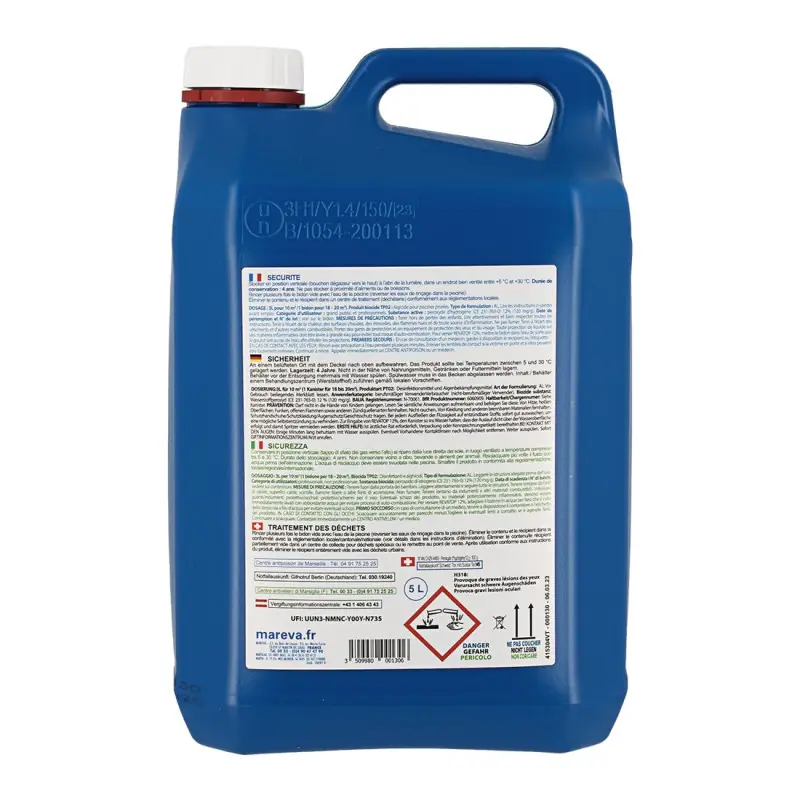 The MAREVA REVATOP 12 % - 5 L algicide is a ready-to-use shock clarifier composed of active oxygen that will allow you to disinfect and restore the beauty of your pool in just a few hours after application, effectively and powerfully removing green algae. Revatop is particularly effective for common shock treatments or clarifying green pool water in just a few hours, returning it to its bluish colour; this anti-algae product is both curative and preventive with an immediate effect that is visible within minutes. Its action is instantaneous, and the water becomes beautiful very quickly, unlike a chlorine shock treatment where you have to wait 24 hours; you can swim again just a few hours later. The advantage of Revatop is that it changes from the chlorine molecule, to which bacteria become accustomed. Based on active oxygen, it only provides oxygen and pure water and proves to be very effective. Moreover, it avoids any addition of stabiliser (a chemical component to limit in your pool) and is compatible with all treatments. Shock treatments should be carried out every 3 to 4 weeks depending on the usage of your pool and various parameters; this is an opportunity to do one while avoiding the drawbacks of chlorine. Thus, you can fully enjoy the pleasures of your pool during the summer!