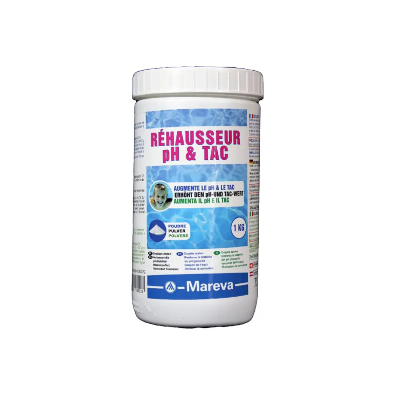 ThePH and TAC MAREVA booster - 1 Kg - ref is an essential 2-in-1 product for achieving a clean pool. The TAC (Total Alkalinity) represents the alkalinity of your pool water. It is one of the essential parameters to check to ensure the water balance with the pH. Generally, a drop in pH is accompanied by a drop in TAC. The addition of the pH+ and TAC+ pair is essential to raise the pH when it is too low (6.5 - 6.8). This booster thus allows for balancing both at the same time.