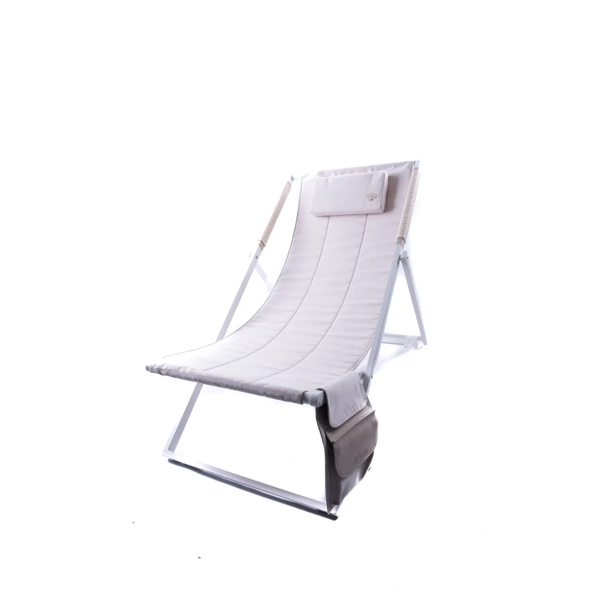 Deck chair – Made of aluminium and painted with sandblasting, the only one to have a waterproof side pocket for storing our small items and a bottom pocket for our larger items