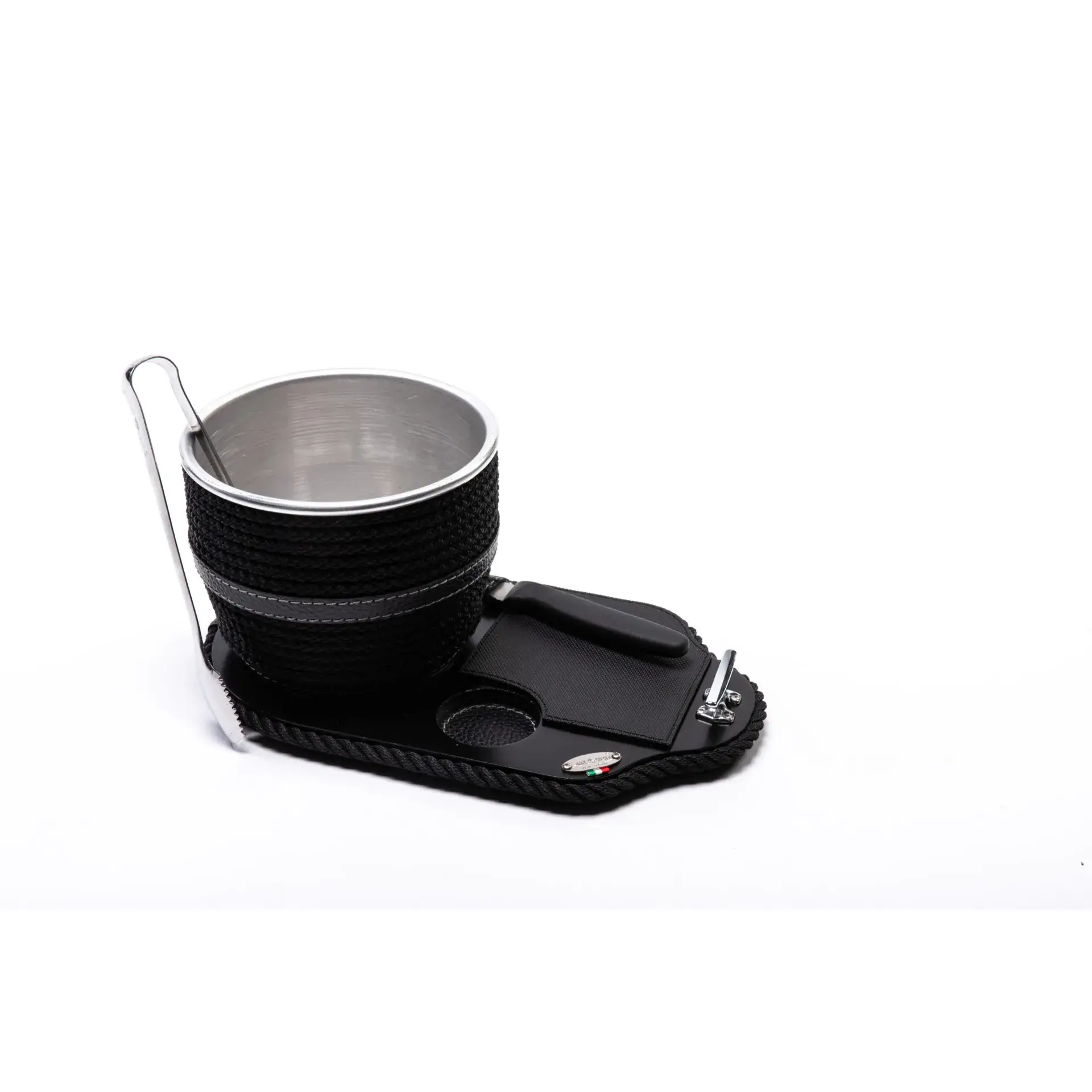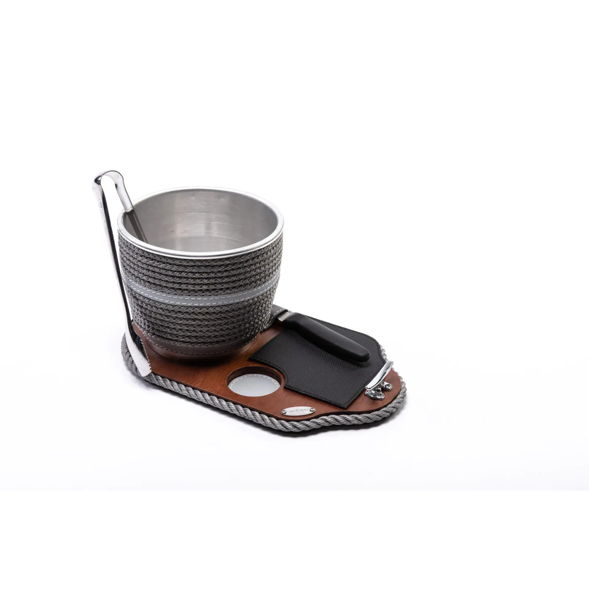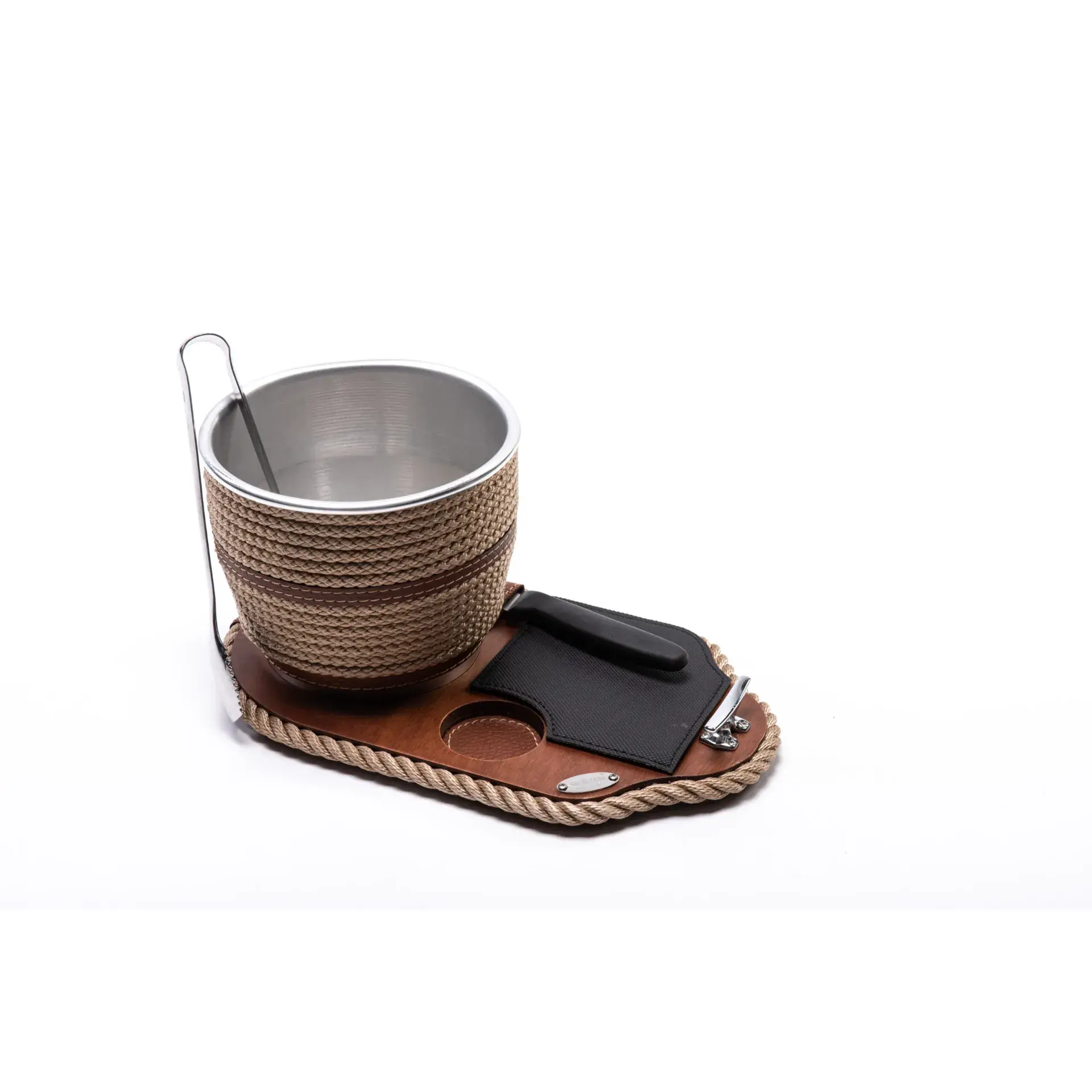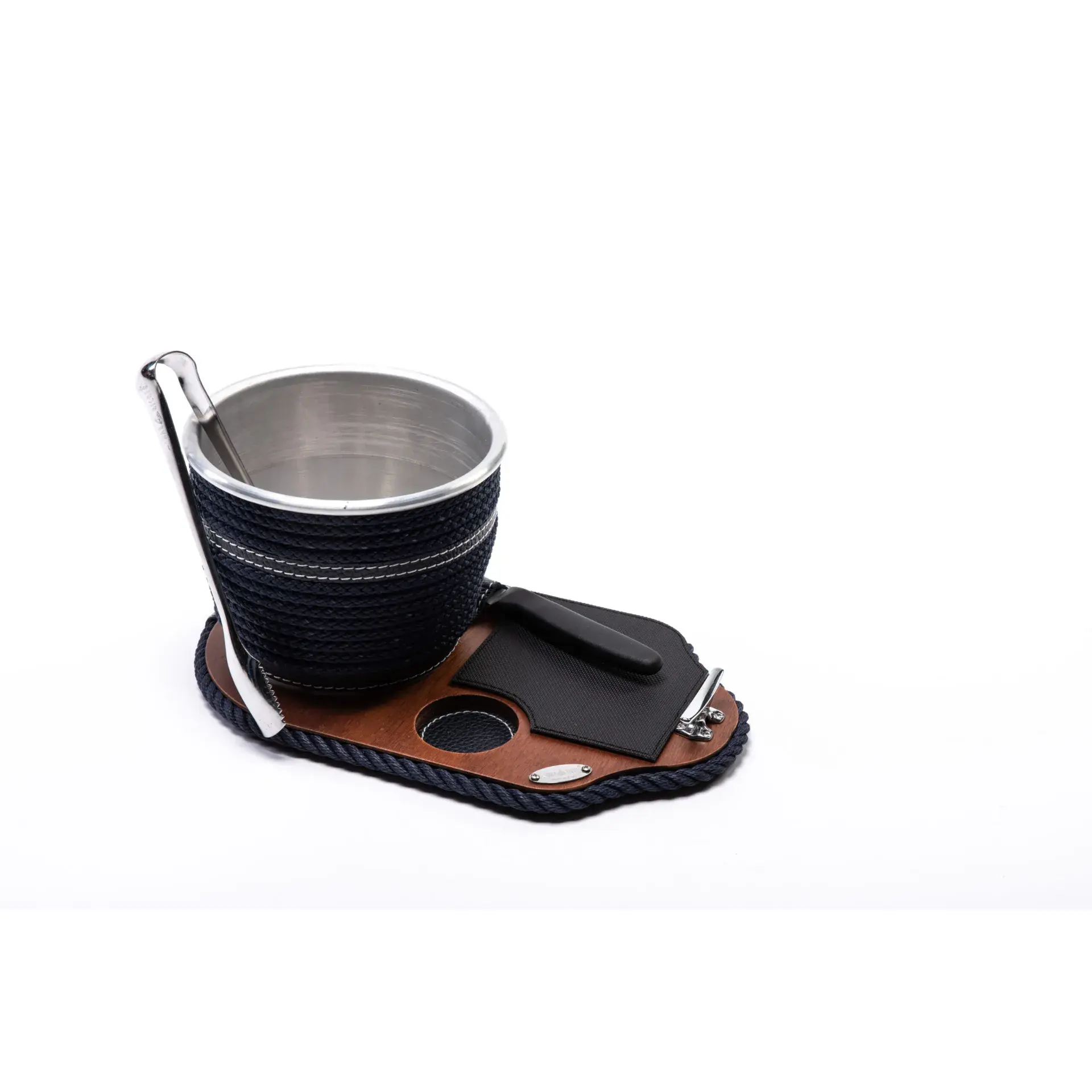 Ice bucket with base, tongs and knife – Coated product, made of wood, steel and a mobile rubber mat. All the essentials for preparing a long drink concentrated in a small space, undisputed practicality and elegance
