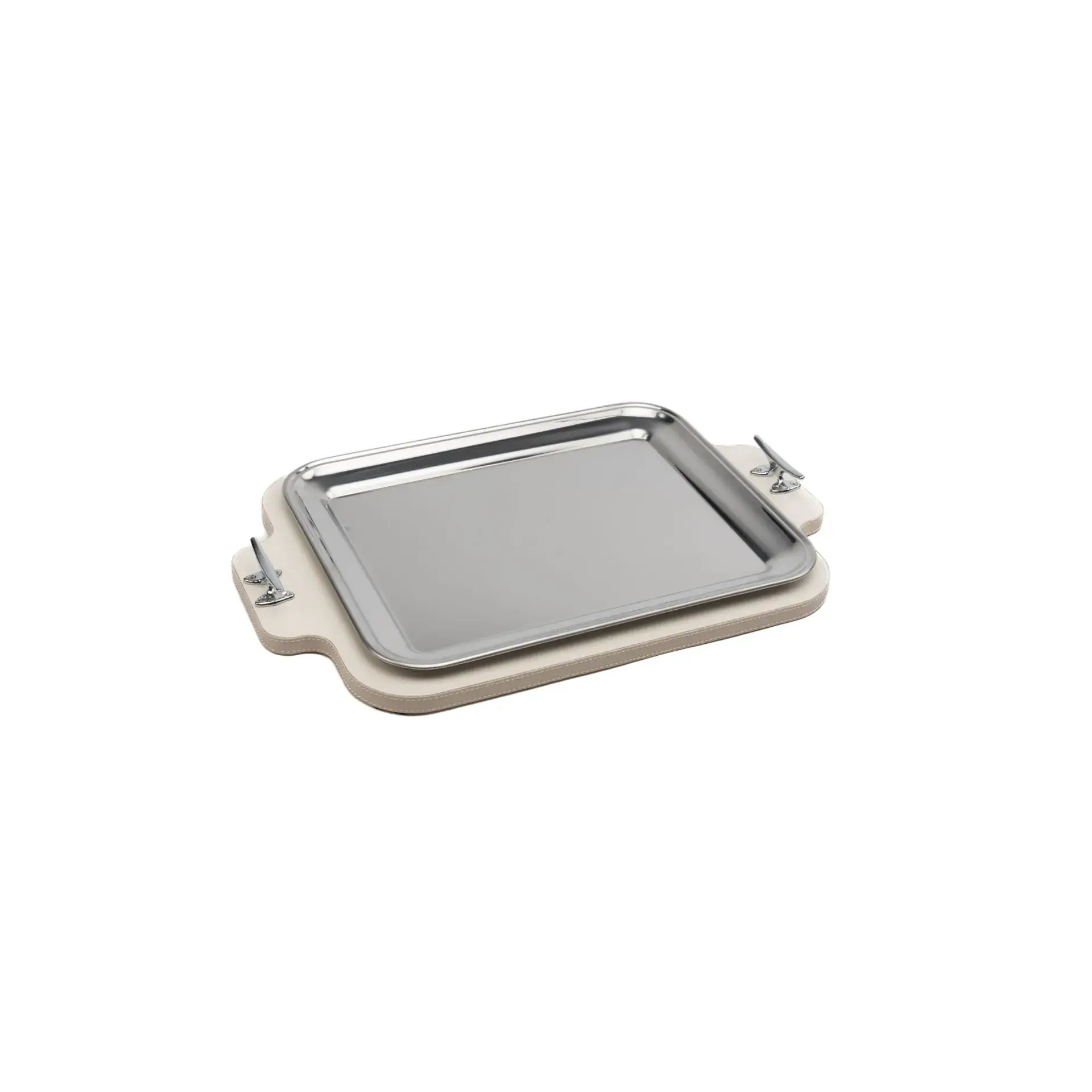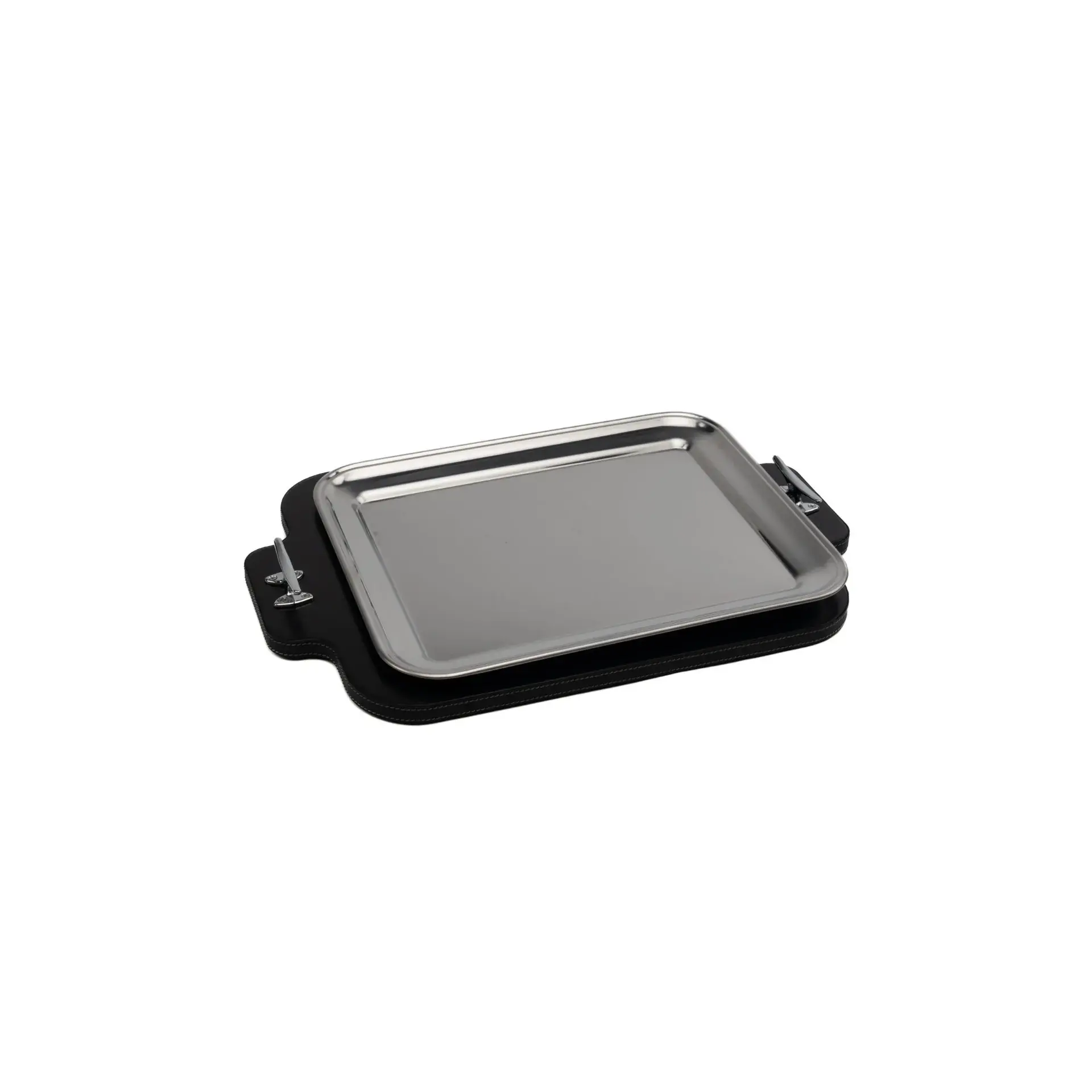 This large rectangular serving tray combines durable wood and steel, ideal for serving a variety of dishes.