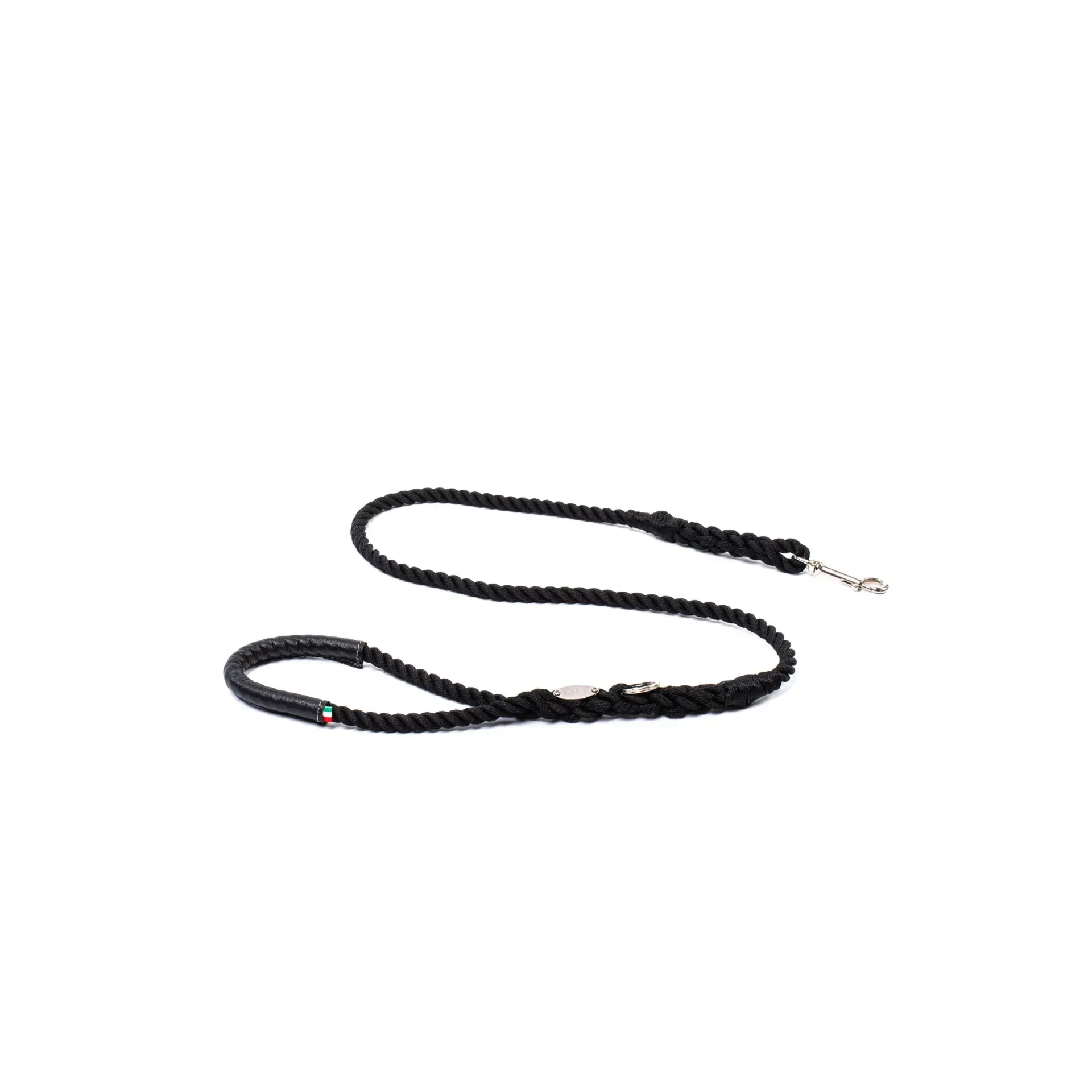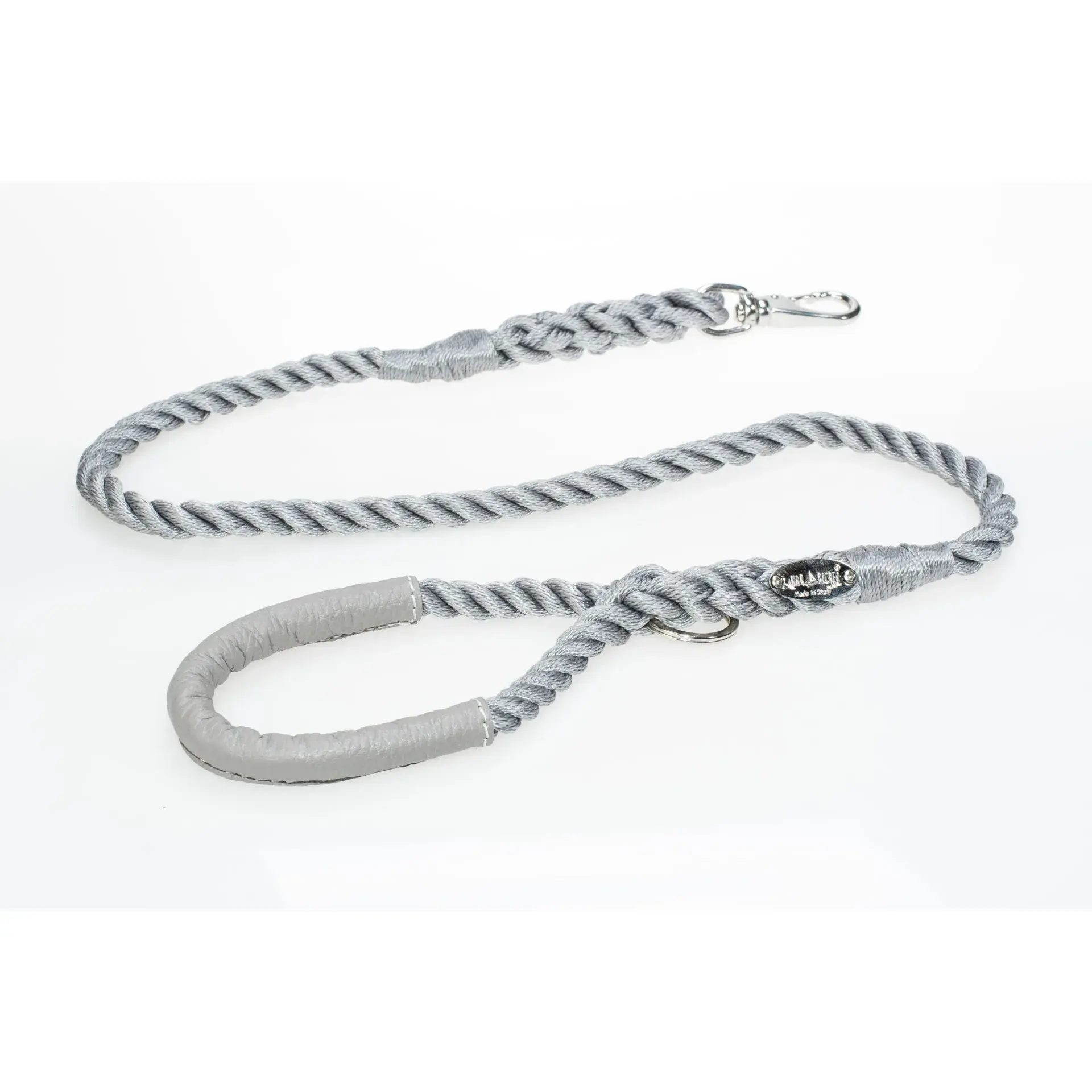 This large weighted leash features a leather handle and a convenient ring for waste bags, ensuring comfort and control.