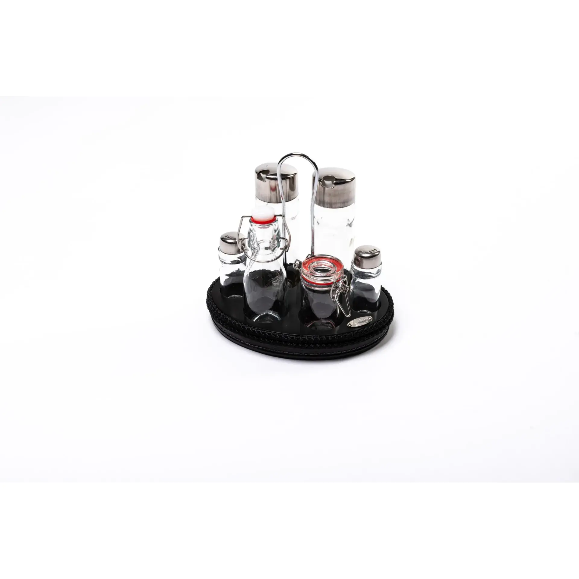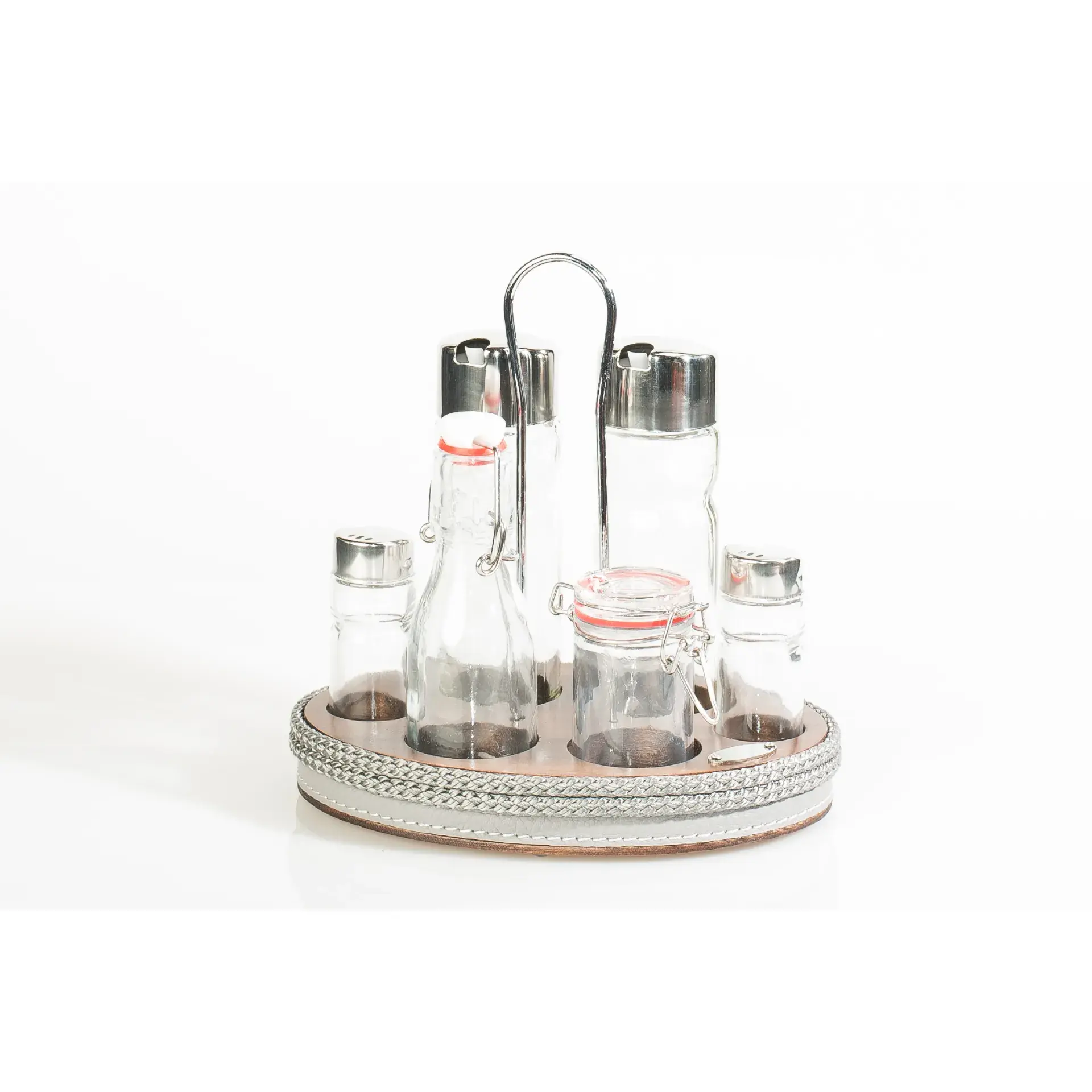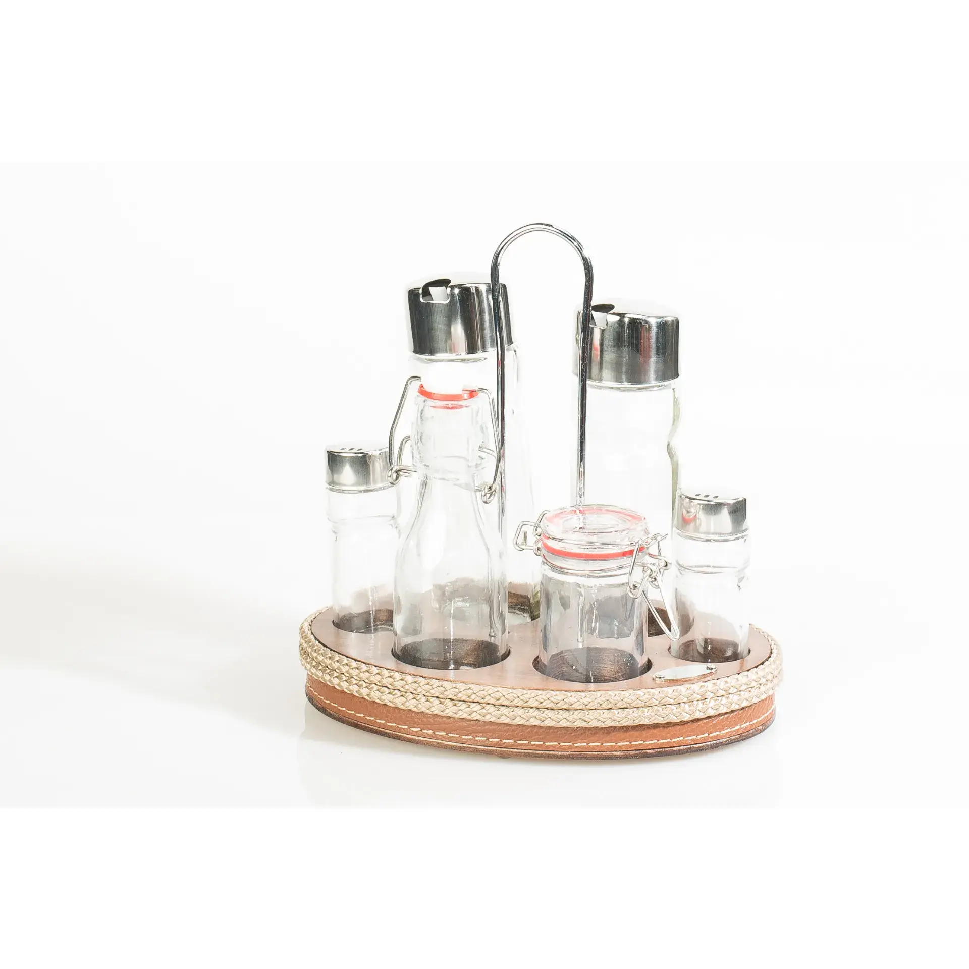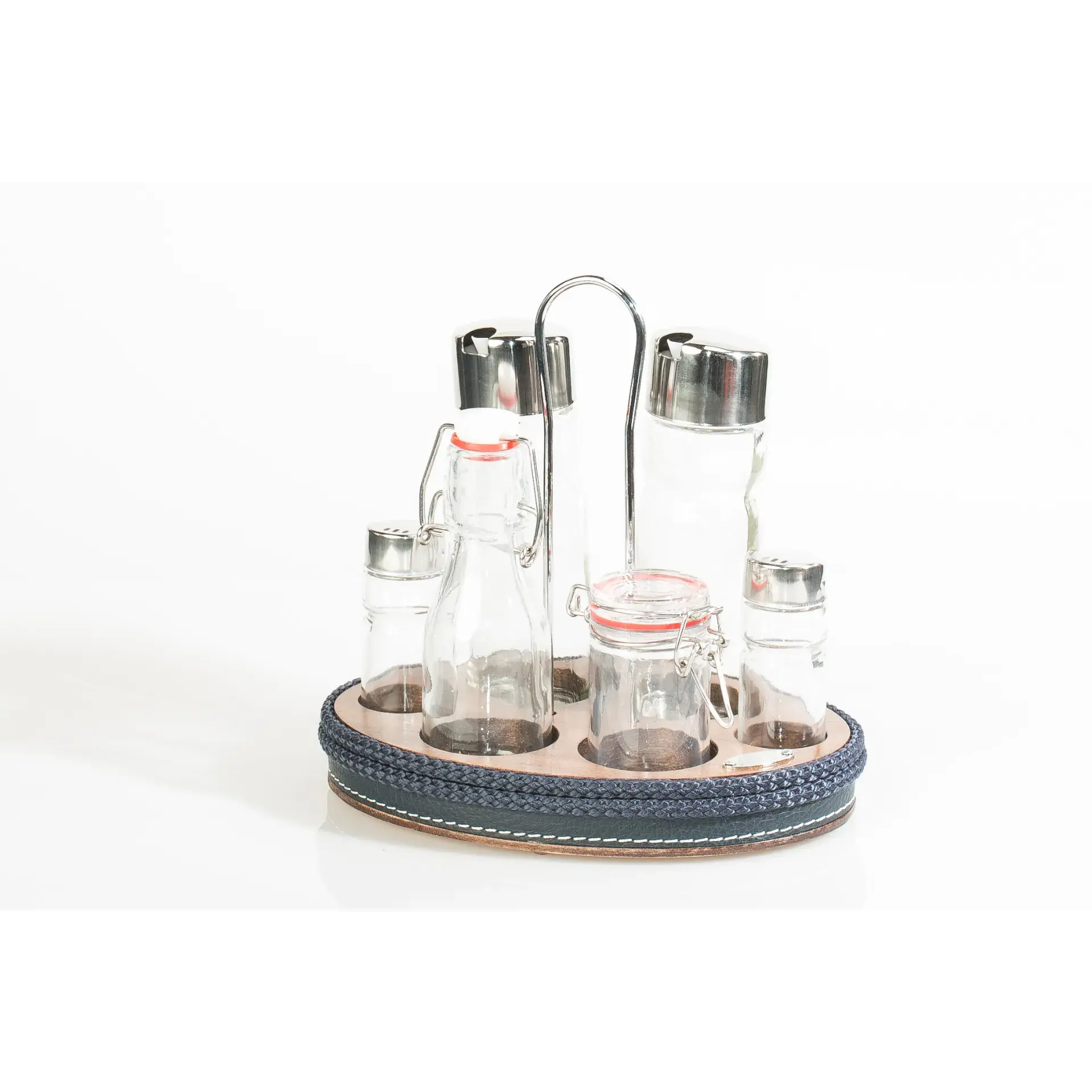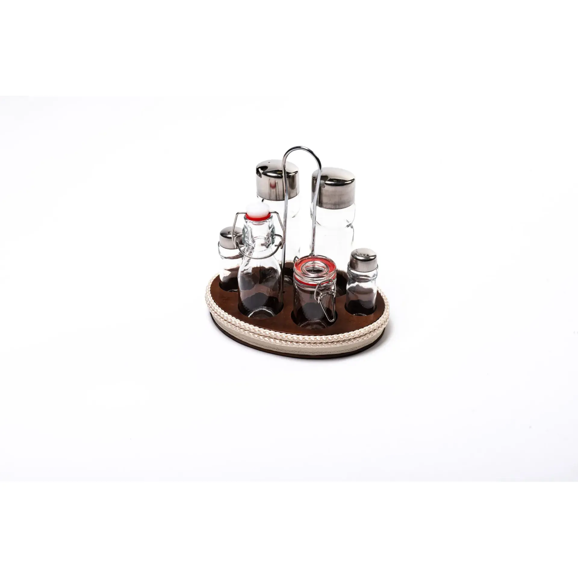 6-piece set – Product covered, made of wood and glass. A product that enhances the food and enriches the table, the idea of 6 dispensers to increase the amount of condiments offered to diners.