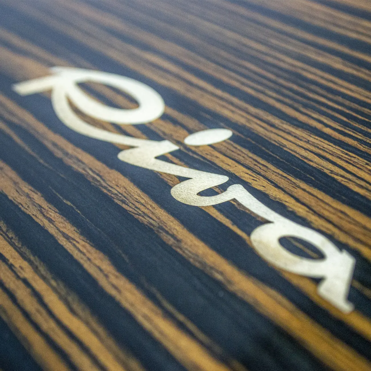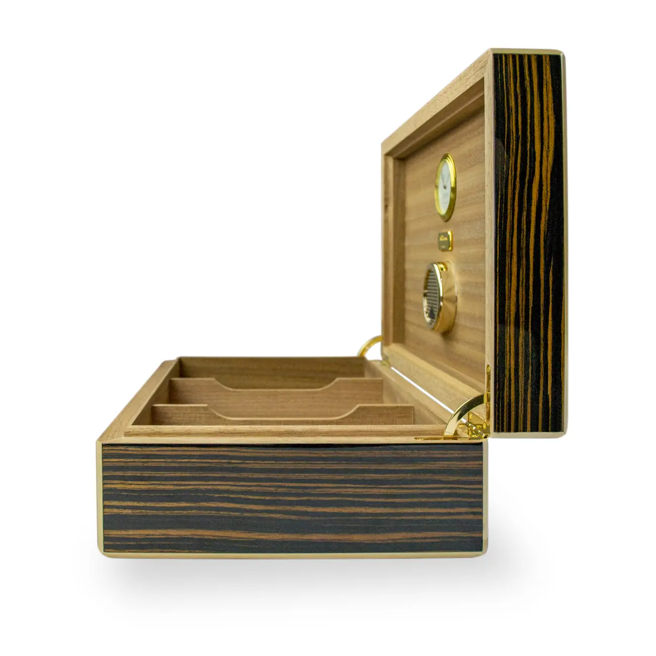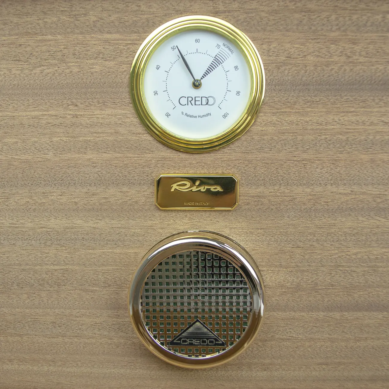 Store your cigars in style with the Riva Humidor featuring a luxurious ebony exterior and rich mahogany interior.