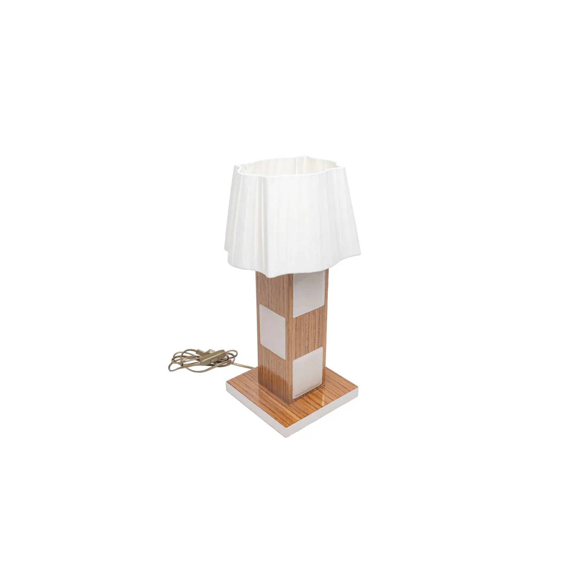 An elegant teak lamp with leather inserts, available in all colours, the pleated shade completes the piece