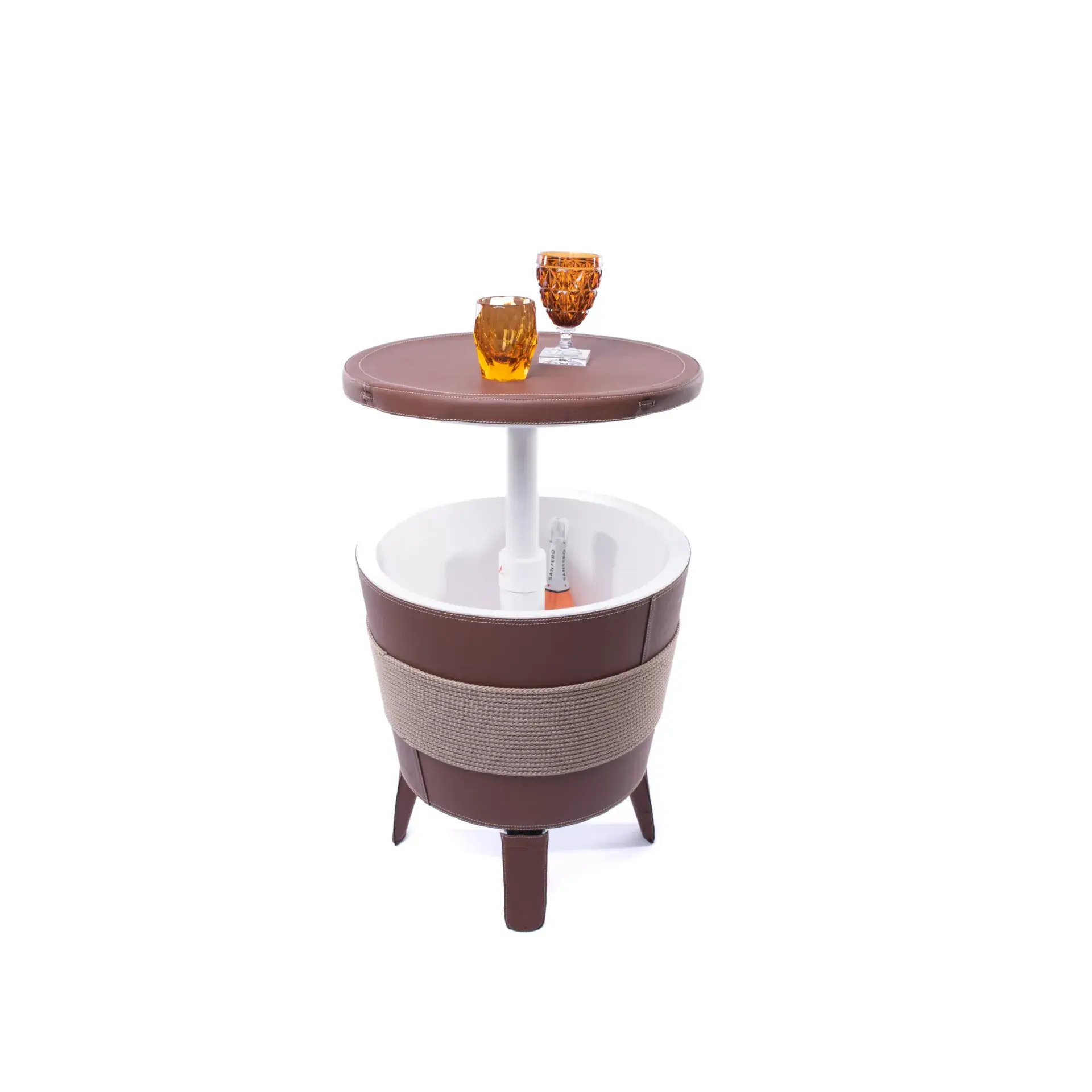 Made of plastic, covered in rope and faux leather. Elegant and space-saving, it is a low table, tall and inside there is a large cooler space to keep a large quantity of drinks cold.