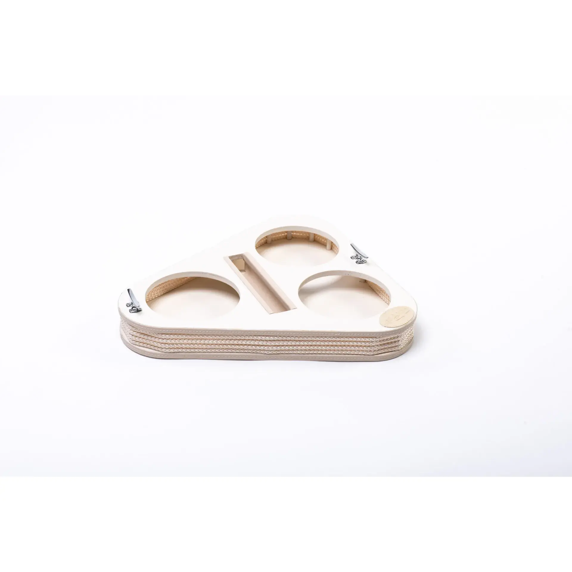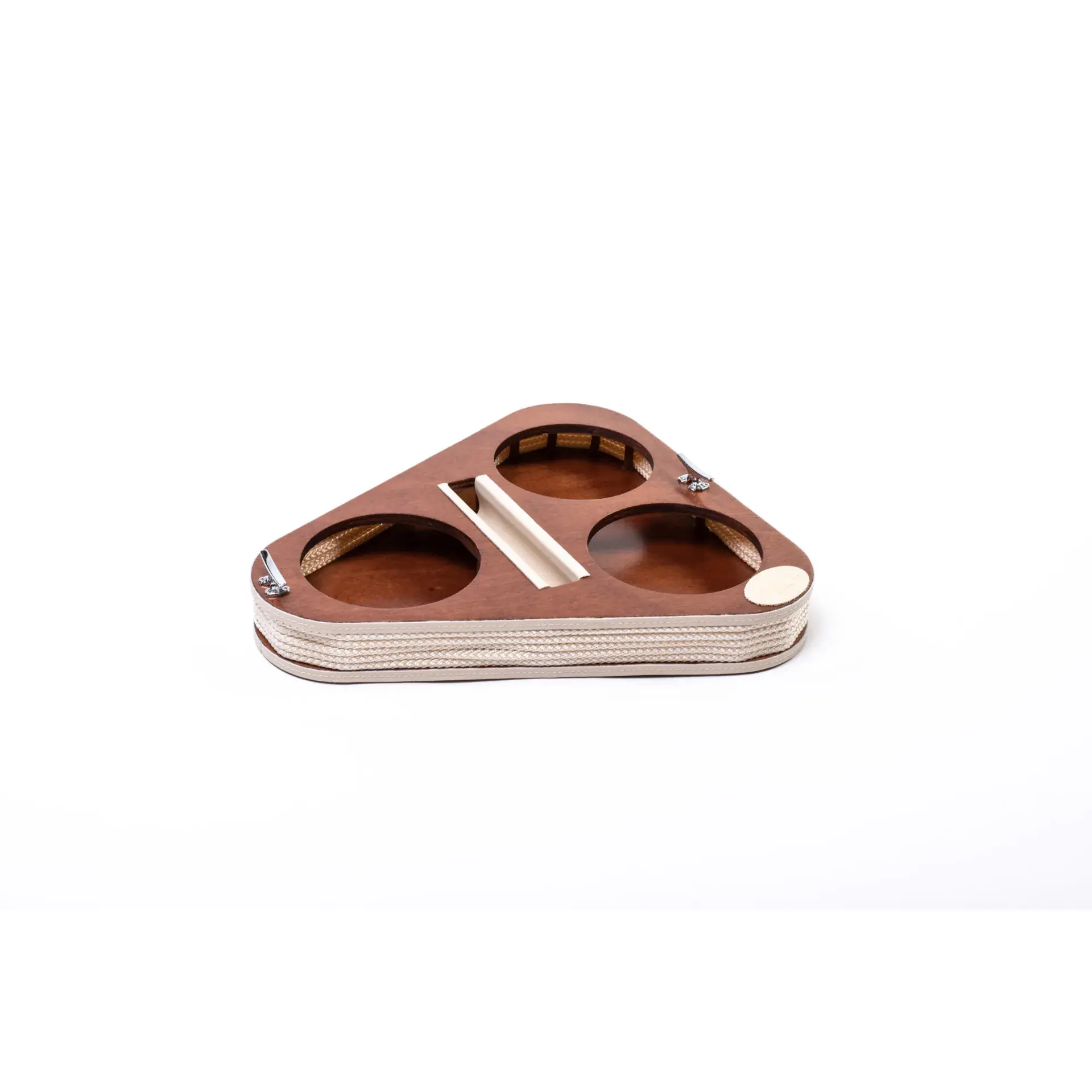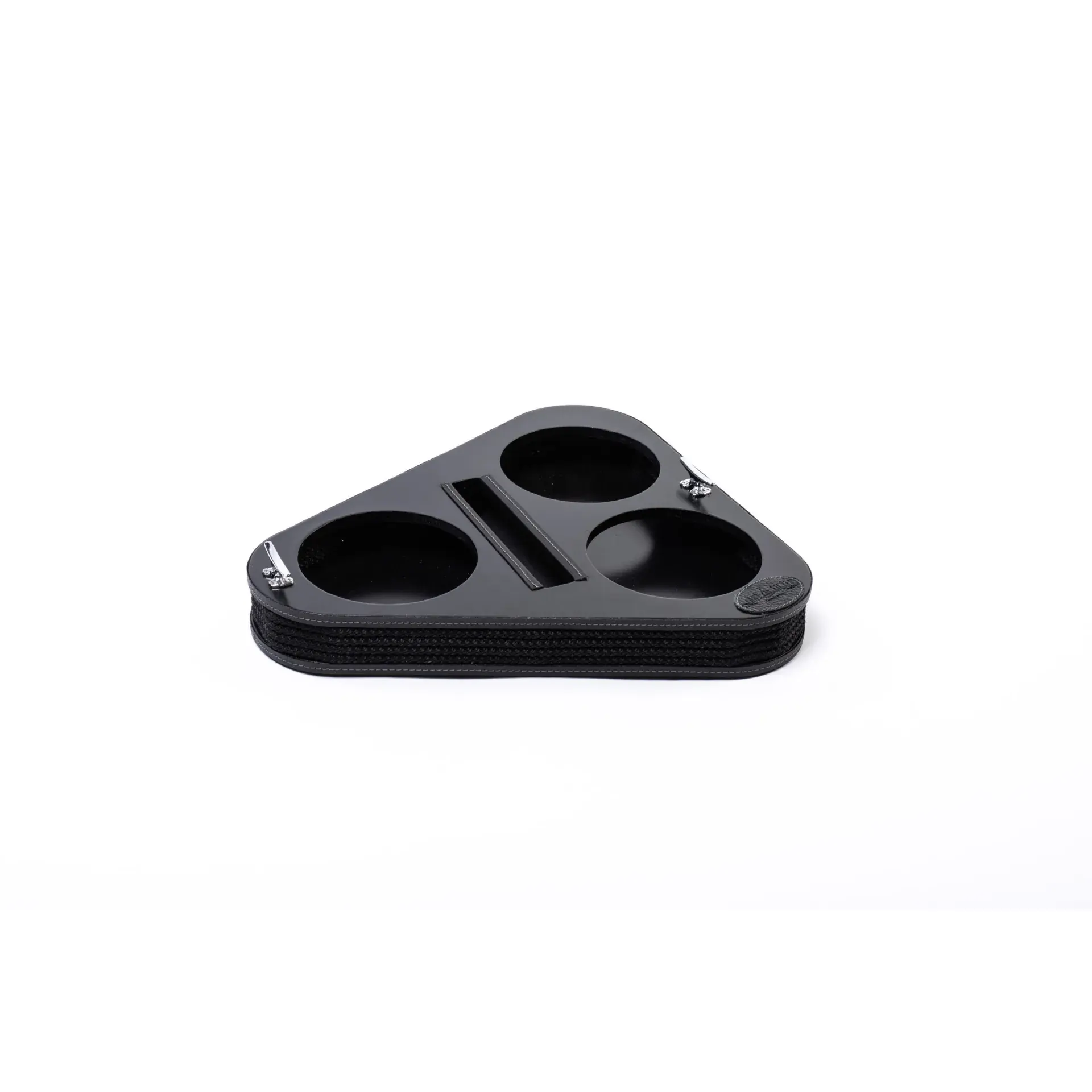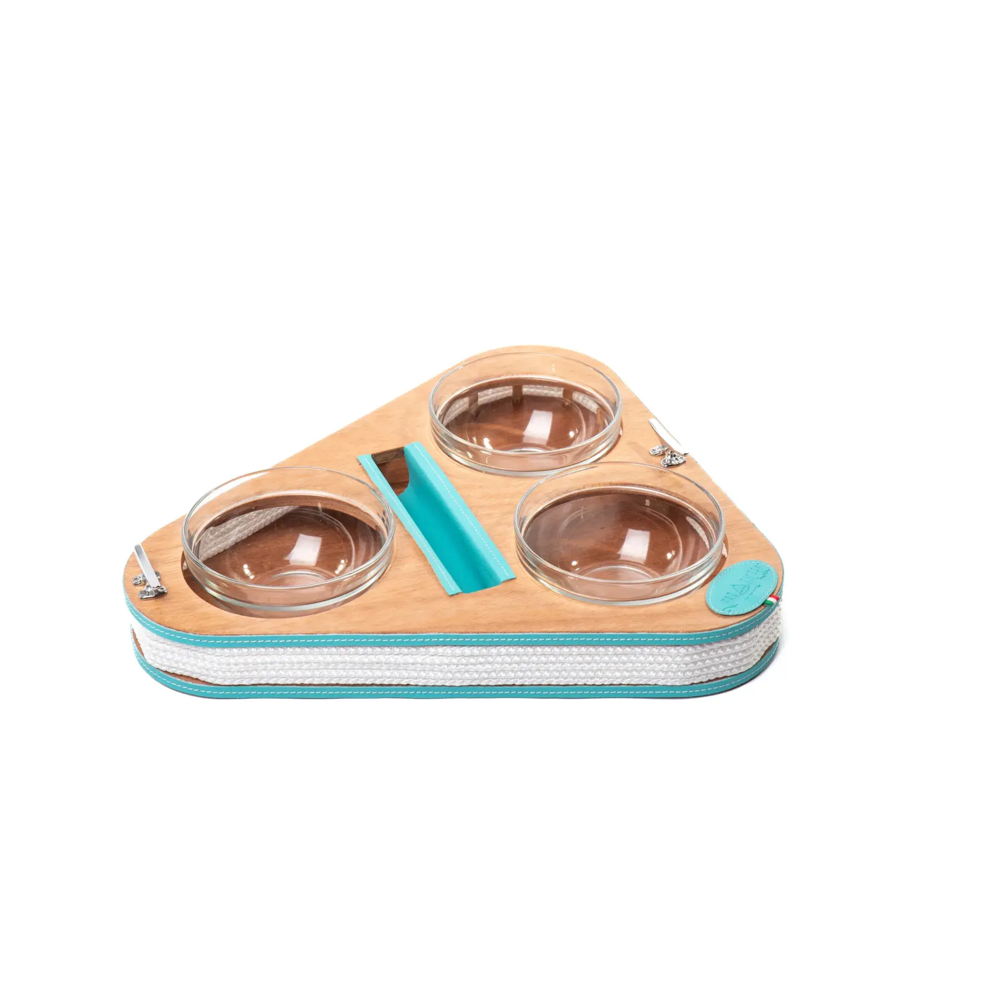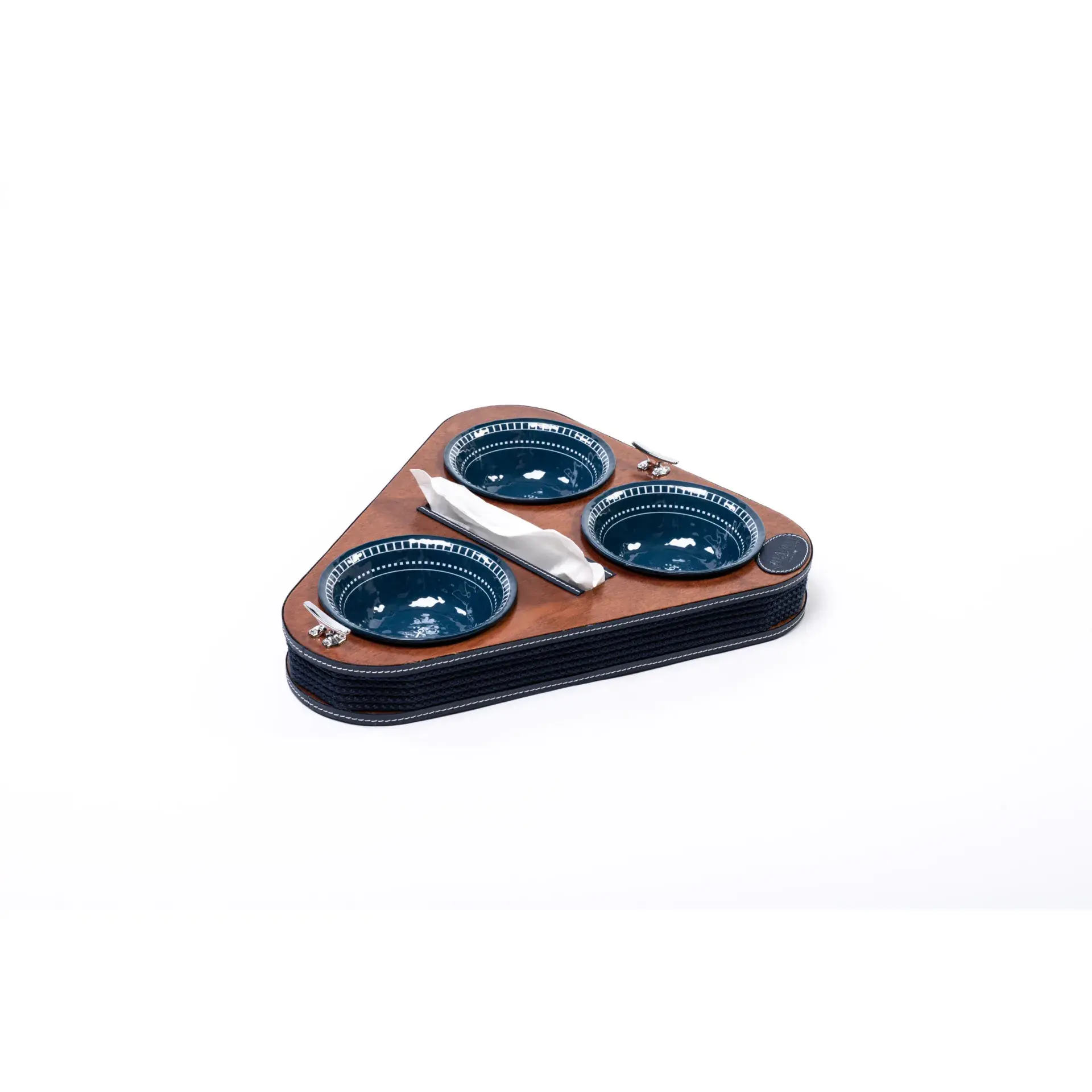 Triangular appetizer holder – glass bowls – Coated product, made of wood. A unique design to offer snacks and/or food, with an interlocking solution for the trays, which will remain stable in any movement condition.