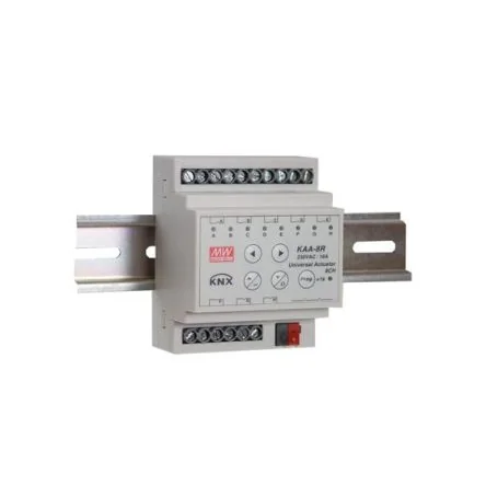 The Mean Well KNX actuator is a 8 channel device with high quality independent latching relay for switch , shutter or any possible mixed applications. The compact design with 4 units (72 mm) wide modular makes it suitable for installation in the distribution board on 35mm mounting rails in the EIB/KNX applications.8 channel actuator in a compact size Suitable for various and mixed applications For AX, C-load , capacitive and inductive of load Program via ETS5.0 software Manual control via push button Programmable various time and scene function