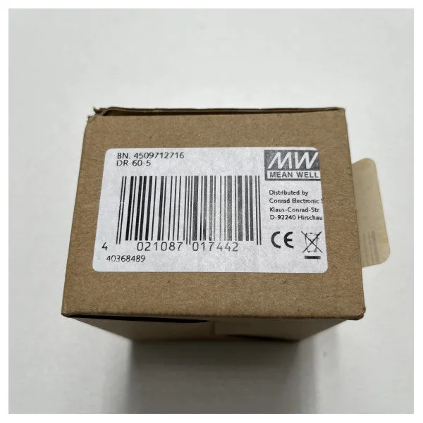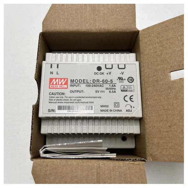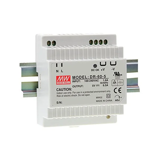 Meanwell DR-60-5: compact DIN-rail power supply with high efficiency The Meanwell DR-60-5 is an efficient and reliable power supply that is ideal for various industrial applications. This compact DIN-rail power supply offers a wide range of features and benefits, including: Features: High efficiency: up to 88% Wide input range: 90-264VAC Single output: 5VDC, 10A Integrated protection: overcurrent, overvoltage, and short-circuit protection Compact size: 70 x 90 x 27 mm DIN-rail mounting: easy installation Long lifespan: MTBF > 100,000 hours Specifications: Input voltage: 90-264VAC Input current: 2.5A max. Output voltage: 5VDC Output current: 10A max. Power: 60W Efficiency: up to 88% Protection: overcurrent, overvoltage, short-circuit Cooling: convection Temperature range: -20°C to +70°C Dimensions: 70 x 90 x 27 mm Weight: 320g Applications: The Meanwell DR-60-5 is suitable for a wide range of industrial applications, including: Automation Machine building Process control Telecommunications Security systems Lighting