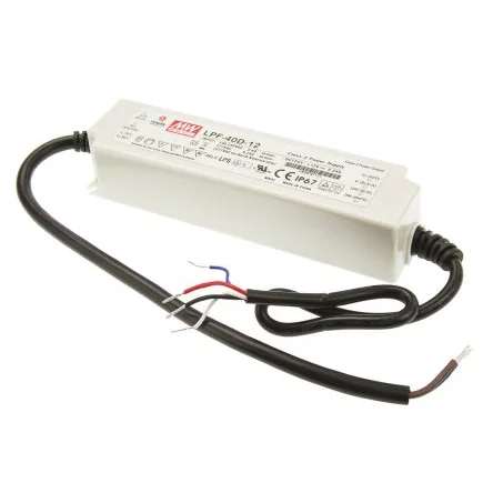 UL8750, EN61347-1, EN61347-2-13 independent, IP67 approved; Design refer to UL60950-1, TUV EN60950-1. cULus, TUV. For Industrial Use Only, not in scope of Regulation (EC) No 125/2009. MTBF to MIL-HDBK-217F Derate output above 50°C operating temperature. 3. Mean Well 40W IP67 Dimmable Constant Voltage LED Driver / Power Supply - LPF Series. LPF-40D series 40W IP67 waterproof dimmable constant voltage LED driver / power supply with universal AC input. These IP67 dimmable LED drivers / power supplies have a built in 3 in 1 dimming function, IP67 encapsulation and built in active PFC function. Suitable applications for these dimmable IP67 LED drivers / power supplies include LED lighting and moving sign applications. Full range universal AC input Fully encapsulated to IP67 Fully isolated plastic case Free air convection cooling Built in active PFC function Built in 3 in 1 dimming function (1 to 10 Vdc or PMW signal or resistance) Short circuit, overload, over voltage and over temperature protection High efficiency of up to 89% Compliance to worldwide safety regulations for lighting EMC compliance to EN55015 Harmonic current compliance to EN61000-3-2 Class C (=60% load); EN61000-3-3