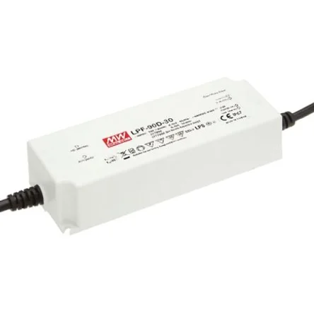 EN61347-1, EN61347-2-13 independent, IP67 approved; Design refer to UL60950-1, TUV EN60950-1. TUV. For Industrial Use Only, not in scope of Regulation (EC) No 125/2009. MTBF to MIL-HDBK-217F Derate output above 50°C operating temperature. 3. Mean Well 90W IP67 Dimmable Constant Voltage LED Driver / Power Supply - LPF-90D. LPF-90D series 90W IP67 waterproof dimmable constant voltage LED driver / power supply with universal AC input. These IP67 dimmable LED drivers / power supplies have a built in 3 in 1 dimming function, IP67 encapsulation and built in active PFC function. Suitable applications for these dimmable IP67 LED drivers / power supplies include LED lighting and moving sign applications. Full range universal AC input Fully encapsulated to IP67 Fully isolated plastic case Free air convection cooling Built in active PFC function Built in 3 in 1 dimming function (1 to 10 Vdc or PMW signal or resistance) Short circuit, overload, over voltage and over temperature protection High efficiency of up to 90.5% Compliance to worldwide safety regulations for lighting EMC compliance to EN55015 Class B Harmonic current compliance to EN61000-3-2 Class C (=60% load); EN61000-3-3