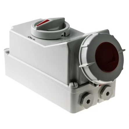 Vertical. Fully interlocked switched (phase) sockets give enhanced electrical safety. Switch cannot be energised until the plug is inserted Plug cannot be withdrawn with the switch in the ON position, which prolongs contact life 16A - 63A can be padlocked in the OFF position Housings are moulded from thermoplastic materials, giving insulation, strength and durability properties Continuous polyurethane gasket between lid and base Neutral block must be removed first before fitting auxillary contact block. * Has metric threads on mounting box cable entries