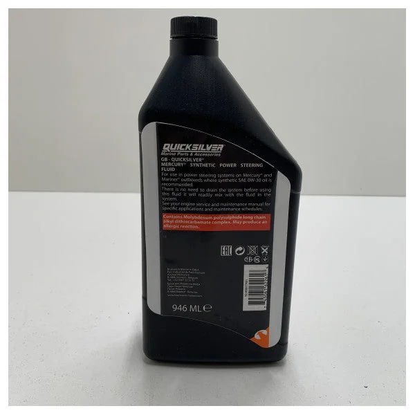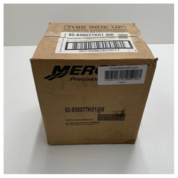 6x Mercury Power Steering Fluid OW-30 Synthetic - 858077K01 Product description: This synthetic power steering fluid from Mercury is specially developed for use in Mercury Mercruiser outboard and inboard engines. It ensures smooth operation of the power steering and protects the steering system against wear and corrosion. Features: Synthetic formula for optimal performance and protection Meets Mercury specifications OW-30 Improves power steering at low temperatures Protects against wear and corrosion Extends the lifespan of the steering system Specifications: SAE viscosity grade: OW-30 API service classification: CF Colour: red Volume: 946 ml (1 litre) Applications: Mercury Mercruiser outboard engines Mercury Mercruiser inboard engines Other steering systems requiring synthetic oil OW-30