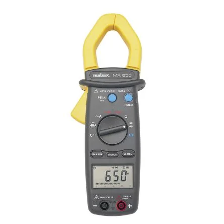 IEC-1010 Class II, 600 V, Cat. III. MX 650 Current Probes. Range of Hall-effect clamp-on multimeters. 4000 count display. Automatic shut-off when idle for 30 minutes. HOLD function available on the MX 640 model.