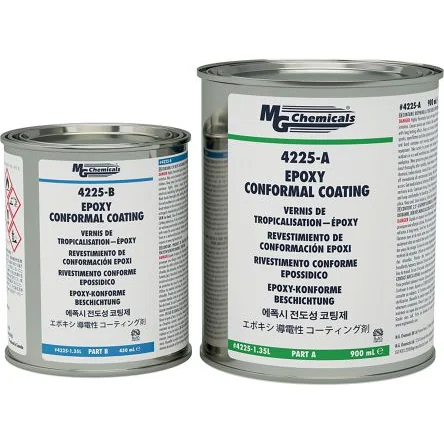 4225 is a two-part epoxy conformal coating. It conforms to a durable, tough, semi-flexible coating with an excellent finish. It protects against harsh chemicals, humidity, corrosion, oil, dirt, thermal shock, and abrasion. It also prevents high-voltage arcing, short circuits, and static discharges. 4225 is a promising choice where extreme physical and chemical resistance are required.2:1 mix ratio Ready to spray Inspection under UV light Thin coating application - can be coated as thin as 0.5 mil Excellent corrosion and chemical resistance