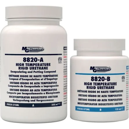8820 is a black, tough, high temperature, two-part polyurethane potting compound. It has a low mixed viscosity and properties similar to epoxy compounds, but with exceptional low temperature stability. As well, it adheres strongly to a wide variety of substrates, including metals, composites, glass, ceramics, and many plastics. 8820 offers exceptional physical protection, a high continuous operating temperature, and superior protection from acids, bases, and many organic solvents.2:1 mix ratio 15 minute working life 48 hour cure at room temperature Constant service temperature of -50 °C to 150 °C (-58 to 302 °F) Low exotherm Excellent dielectric properties