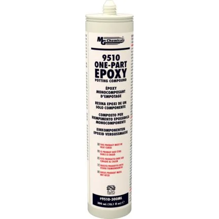 9510 is a black, rigid, one-part epoxy potting compound. It has unlimited working time at room temperature and does not require frozen storage. It provides excellent electrical insulation and protects against static discharges, vibration, thermal shock, environmental humidity, salt water, fungus, and many harsh chemicals. 9510 has a low viscosity and can be readily used in manual, pneumatic and robotic dispensing processes.Up to 12 months shelf life at room temperature Minimum cure temperature of 80 °C [176 °F] Ready to dispense no mixing is required Broad service temperature -65 to 150 °C [-85 to 302 °F] Extremely high tensile and compressive strength
