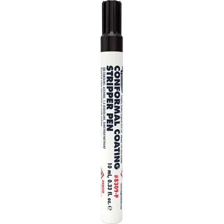 The 8309 Conformal Coating Stripper is available in both liquid and pen format. It removes most reworkable conformal coatings and readily removes thermoplastic (non-cross linked) acrylics, urethanes, and silicones based conformal coatings. It also facilitates the removal of some thermoset coatings like cross-linked silicones and polyurethanes by softening or swelling the coat to aid with mechanical removal. This stripper is safe for most types of PCB components. It is fully biodegradable and environmentally safe. Applications & Usages: The primary applications of the 8309 are for PCB maintenance and repairs. It also works well for removing conductive ink lacquers. The low viscosity allows PCBs to be easily submersed in the stripper.Strips acrylics, polyurethanes, and silicones Liquid format allows for full submersion of PCBs Safe on metals Contains no SVHC’s Biodegradable Available in liquid