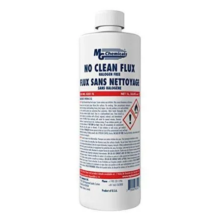 The MG Chemicals No Clean Flux, Halogen Free is designed for lead free alloys and is also well suited for leaded alloys. Because it is low solids, this organic flux leaves virtually no residues so that the board appears cosmetically clean after exiting the wave soldering machine. It is specially designed to minimize bridge defects and solder defects.Halogen Free Low residues, leaving the board and joints shinny and bright Excellent wettability Usable for both lead free and leaded alloys Rosin/Resin Free Meets J-STD-004B RoHS Compliant Printed circuit board assembly Printed circuit board rework Printed circuit board touch up Surface mount assembly Stencil soldering Wave Soldering