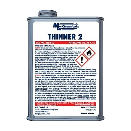 This liquid is highly flammable and must be kept away from flames and other ignition sources. Avoid breathing in fumes or direct contact with the material. MG Chemicals Thinners. The MG Chemicals 4352 clear, moderate drying thinner is designed to use with conformal products. The solvent is an excellent solution for use on sensitive substrates. Features and Benefits. Not classified as a Hazardous Air Pollutant (non-HAP) Excellent levelling and gloss Promotes good flow properties and suppresses blushing Compatible with most sensitive substrates that are used in electronic parts and enclosures Compatible with film forming paint products with acrylic, alkyd, cellulose acetate butyrate, epoxy, nitrocellulose or polyester resins Can be mixed with alcohols, aldehydes, glycols and ketones