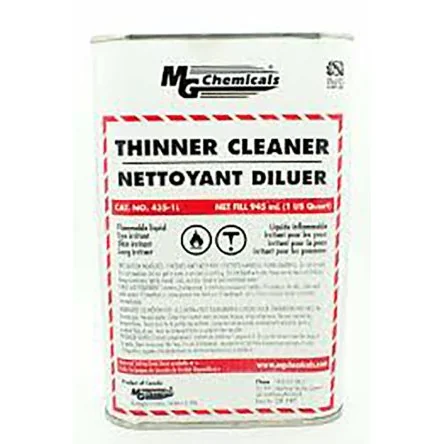 MG Chemicals 435 Thinners. The MG Chemicals 435 clear, fast drying thinner with low VOC solvent that has been designed to use with conformal and EMI/RFI shielding coating products. The 435 solvent has a fast dying time and ensures good adherence to plastic substrates. Features and Benefits. Highly miscible Can be mixed with water, alcohol, ethers, glycols and ketones Fast drying Low VOC