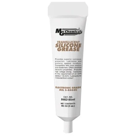 Conforms to 21 CFR section 178.3570. MG Chemicals 8462 Silicone Greases. MG Chemical 8462 is a translucent silicone grease that is used when you need protection from moisture, oxidation, humidity or static discharge on your connectors. The dielectric grease is safe to use on elastomers, metals, rubber and plastics. Features and Benefits. High dielectric strength. Odourless. Stays where you put it. Gives good protection from rust. Non-melting. Useable for incidental food contact. Typical Applications. Use in high-voltage connections associated with gasoline engine spark plugs, circuit breaker lubrication, to seal static grounding.