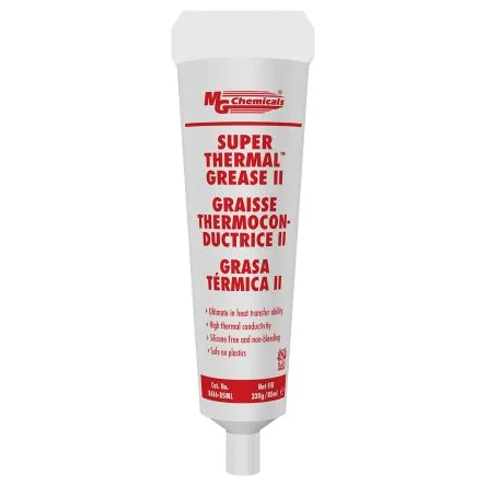 The thermal grease does not add mechanical strength to the bond between heat source and heat sink. Use a mechanical fixation mechanism such as screws, allowing for pressure between the two, spreading the thermal grease onto the heat source. MG Chemicals Super Thermal grease II. MG Chemical 8616 super thermal grease II is a synthetic oil-based low thermal resistant grease. Designed for those applications where the maximum heat flow is a must. The thermal grease is available in a 3 ml syringe ; 124-7689 124-7689 , a 25 ml tub ; 124-7690 124-7690 or a 85 ml tube ; 124-7691 124-7691. Features and Benefits. Silicone free. High dielectric strength. Non-corrosive. No metallic fillers. Safe on plastics. Typical Applications. Use when you want to improve the thermal interface contact conductivity between heat sinks, LEDs, motors, and heat-generating electronic components. Such as CPUs, GPU chipsets and power components. Use to improve the thermal interface between irregular and pitted surfaces.