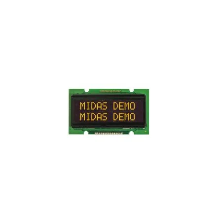 Midas Character OLED Displays, COB. This series of Organic Light Emitting Displays (OLEDs), from Midas Displays, are chip-on-board (COB) character format OLEDs with passive technology. These easy-to-use OLED devices are made up of a PCB mounted with both the driver and the display. As an ideal, drop-in replacement for standard LCD character modules, the Midas COB OLEDs have a comparable footprint to LCD character display common board sizes. With their high brightness, high contrast and fast refresh levels, the graphic COB OLED displays are a seamless upgrade from standard LCD modules. The Midas OLEDs are available in a range of colour options including yellow, green, blue red and white, and are ideal for applications where a specific colour of display is required on a black background appearance (negative mode). The Midas character COB OLEDs also boast an extremely wide viewing angle of up to 175°, creating a solution for applications where it is necessary for the display to be readable from all angles. These OLED devices also offer lower energy consumption than traditional LCD modules and a wide operating temperature range. Their low profile display height and interface comparable with HD44780 means the Midas COB OLEDs are suitable for a variety of traditional applications. Available in 8 to 40 character options on 2 lines, Midas ‘ OLED displays offer 4 font sets on 1 device including English, Japanese, Western European and Cyrillic character fonts. The Midas COB OLED devices have a 5x8 dot matrix characters with a height of 5.50 to 5.57mm.. OLED Operating Lifetimes: (Ta = 25° / Initial 50% checkboard brightness 40nits) Yellow: 100,000 hours Green: 100,000 hours Red: 100,000 hours Blue: 50,000 hours White: 50,000 hours