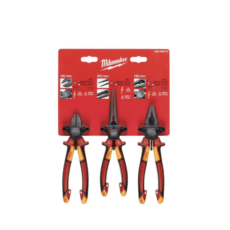 Set of 3 VDE MILWAUKEE pliers - universal cutting and long nose 4932464575 thanks to their insulation tested at 10,000V these pliers are perfect for electricians. Practical and safe, you will benefit from a secure and comfortable grip.