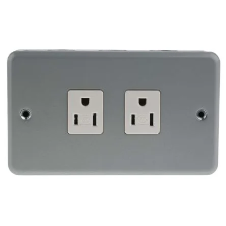 MK Electric Socket OutletThe MK Electric socket-outlet is designed to withstand heavy use while combining safety and innovative design with the ease of installation. It has a voltage rating of 127V and a current rating of 15A with the number of poles of 2-Pin+E American socket. The terminals are in-line, with backed out and captive upward-facing screws for ease of wiring. Supplied with: Two M3·5 fixing screws. Metalclad Plus The new Metalclad Plus range from Caradon MK Electric Ltd. is designed to withstand heavy use within industrial, domestic and commercial environments whilst combining safety and innovative design with ease of installation. The outer casing is manufactured from tough mild steel with a scratch-resistant paint finish. Plastic shrouds on products are moulded from a composite of polycarbonate and ABS. All front plates have a chamfered profile to combine robust engineering with stylish appearance.Features and BenefitsNEMA 5-15R socket Surface mount Steel material Earth terminal White markings on the rear of the product gives identification for connection Minimum 3mm contact gap for safe switch isolation One screwdriver type needed to install the whole range Can be flush or surface mountedApplicationsIndustries Domestic Commercial environmentsCertificationsANSI/ESD S20.20:2014 BS EN 61340-5-1:2007
