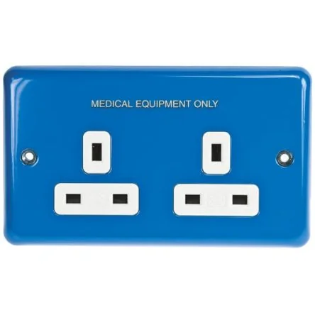 Durable blue 2 gang plug socket designed for medical equipment use.