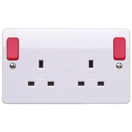 BS 1363 Pt 2: 1995. 13A BS Two Gang Double Pole Flush Mount Socket in White with Red Outboard Rockers. Double socket (2 gang) Flush mounting White with red coloured outboard switch rockers Dual earth terminals