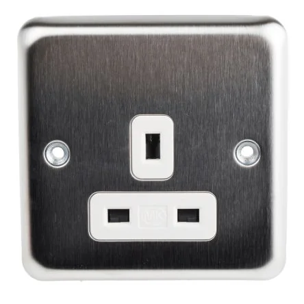 MK Electric White 1 Gang Plug SocketThe MK Electric white 1 gang plug socket works on 13A current source. It is made from brushed stainless steel, satin gold, brushed chrome and polished chrome finish material. This socket looks stylish and perfectly complements contemporary and classical interior.Features and Benefits• 3-pin child resistant shutter system • Clear terminal marking for easy identification • Stylish curved designApplications• Residential and commercial uses • To plug portable electrical appliances • General purpose industrial use • To plug USB and mobile chargers