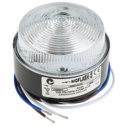 Moflash BeaconThe Moflash red lens LED beacon incorporates 12 ultra-bright surfaces mount LEDs offering a cost-effective solution for a wide range of general signalling solutions. It is ideally suited for local indication the beacon is controlled by either two wires (flashing mode) or three (static mode).Features and BenefitsThe supply voltage ranging between 10VDC and 100VDC LED long life Continuously rated Easy, snap-fit installation (with base plate for surface mount option) 180° visibility Dustproof and submersible in water Easy, snap-fit installation (with base plate for surface mount option) Height is 50mm and base diameter is 76mm Surface mount UV-stable polycarbonate lens and body Operating voltage ranging between -20°C and 55°CApplicationsRefuge trucks Utility vehicles Agriculture Plant and contracting, Fleet vehicles Industrial Commercial buildingsCertificationsIP67 rated CE certified