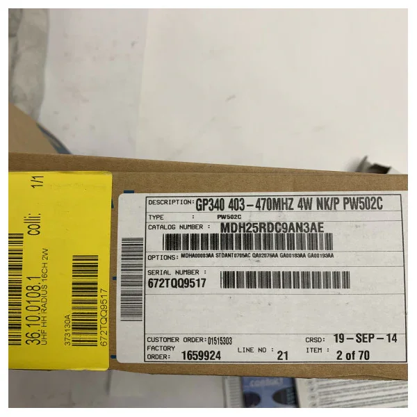 Motorola GP340 UHF Two-way portable handheld radio 403-470MHz - MDH25RDC9AN3AE is the ideal solution for long-distance communication and in rugged environments. With a frequency range of 403-470MHz and a power of 4 watts, this radio provides clear and reliable communication for professional users. Features & Specifications:- Frequency range: 403-470MHz- Power: 4 watts- 8 channels - Pre-programmed frequencies- Scan function- Hands-free use - Robust housing - Water and dust resistant (IP54)- Long battery life of up to 11 hours - Compact and lightweight design Why choose this product? The Motorola GP340 UHF Two-way portable Handheld Radio is a reliable and durable choice for professional users looking for clear communication over long distances. With its robust housing and water and dust resistance, this radio is suitable for use in even the most challenging environments. The compact and lightweight design also makes it a convenient choice for on-the-go. With a long battery life of up to 11 hours, you can rely on this radio for extended communication without interruptions. Choose the Motorola GP340 UHF Two-way portable Handheld Radio for reliable communication in any situation.