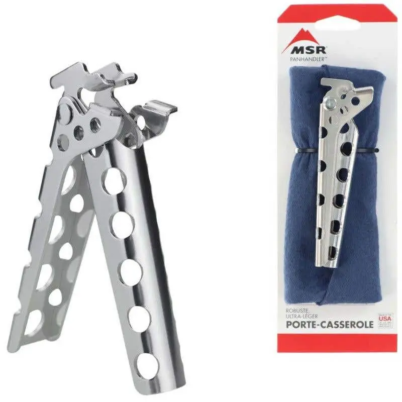 The MSR PanHandler Pot Lifter is a lightweight and durable tool designed to safely handle hot cookware during outdoor cooking. It is compatible with all MSR cookware and can support up to 10 pounds (4.5 kg). The lifter includes a Packtowl sleeve to protect pots during transport.
