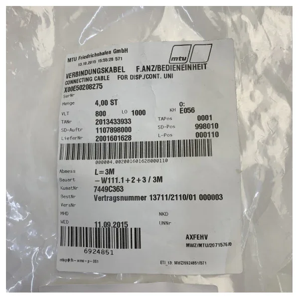 Are you looking for a reliable and high-quality connector cable for your MTU Display Control Unit? The MTU X00E50208275 Connector cable is the perfect solution to ensure seamless communication and optimal performance of your system. This cable is specifically designed to meet the stringent requirements of MTU applications, making it ideal for both new installations and replacements. Invest in original MTU quality for durable and trouble-free operation.