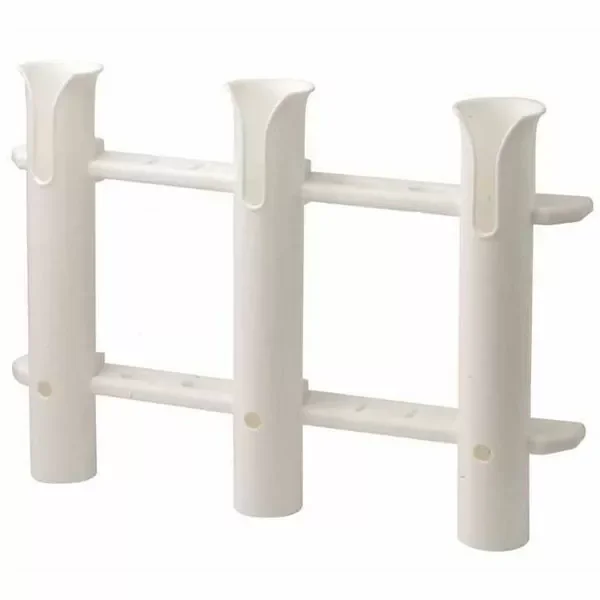 Durable plastic multiple rod holders with reinforced support for secure fishing gear storage.