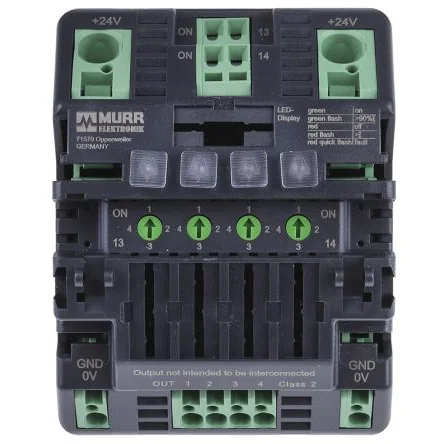 UL Approval. MICO Classic Circuit Breaker. The MICO Classic range by Murr Elektronik are an intelligent power distribution system for 24 V dc systems. MICO monitors currents and indicates via the LED when the maximum load is being approached, the current range can then be adjusted. If the current is ok the LED is green, when 90% of the selected current range is reached the LED blinks green. If there is a short circuit or the selected load is exceeded the LED blinks red and switch off the selected channel. Each channel can be individually switched on or off by the simple press of a button adding excellent flexibility. The MICO range has many advantages, including reduced risk of fire caused by overcurrents, and its ability to store operating statuses even after a power reset. Features and Benefits. Electronic current monitoring 2 or 4 output channels Adjustable current ranges Spring clamp terminals Bridge system on both sides 90% warning notice with blinking LED Group alarm contact (potential-free) Cascading start of individual current paths Space saving of up to 30% in a control cabinet. Product Application Information. Multiple MICO modules can be connected via the integrated bridging system, reducing both installation time and the potential for wiring errors. Spring clamp terminals enable installation in the shortest time possible. They are maintenance free and vibration resistant. Periodic maintenance to retighten screw terminals is no longer required