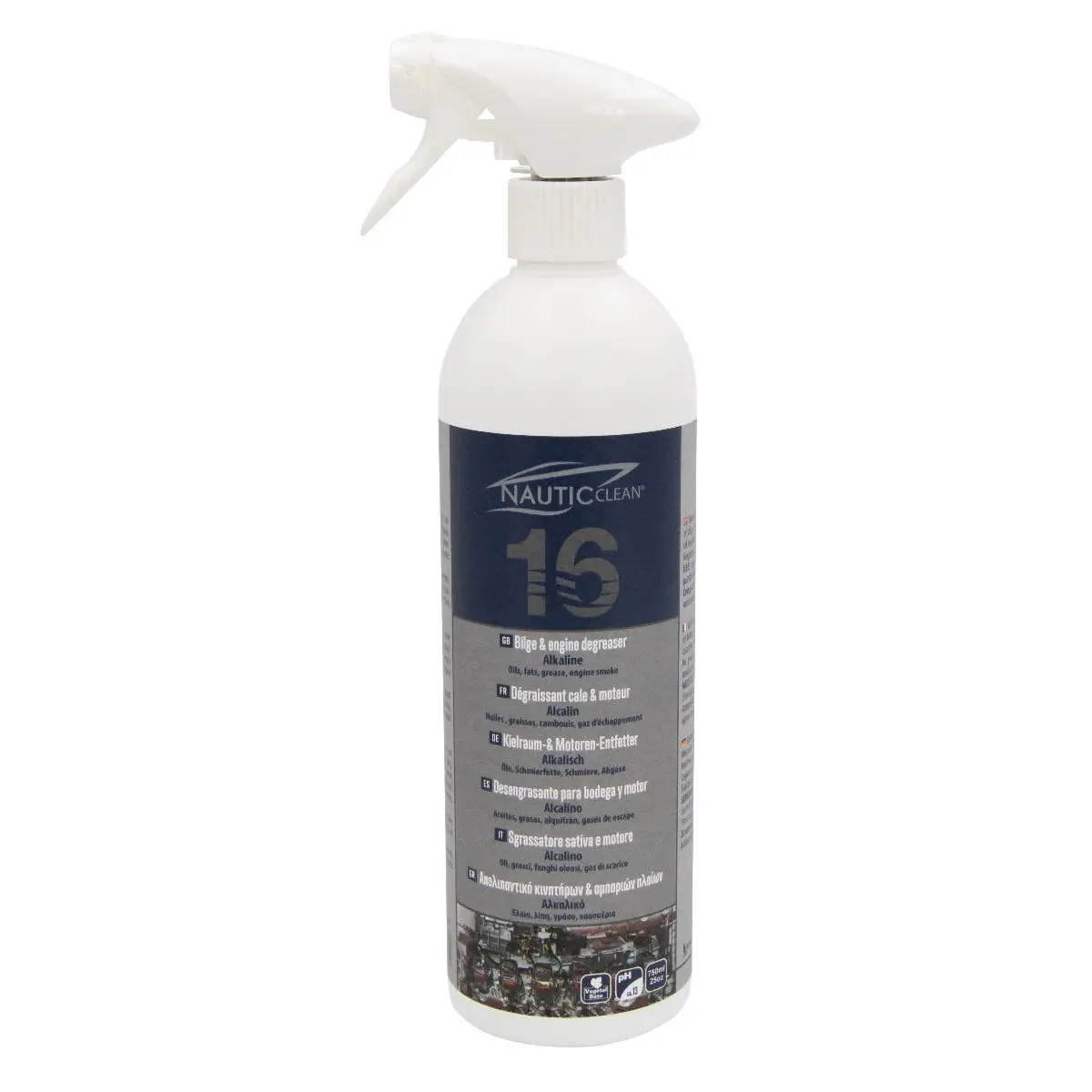 The Nautic Clean 16 Bilge and Engine Degreaser is a specialized cleaning solution designed for the effective removal of contaminants from boat engines and bilges. Its formulation ensures thorough cleaning without damaging light alloys, paints, or plastics. The product is environmentally friendly, utilizing surfactants of vegetable origin that comply with biodegradability criteria as defined in Regulation (EC) No 648/2004 on detergents.