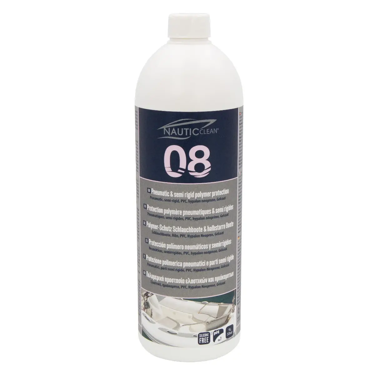 The 08 Pneumatic & Semi-Rigid Polymer Protection by Nautic Clean is a specialized film-forming polymer treatment designed to provide an anti-soiling effect and a glossy finish on pneumatic and semi-rigid tyres. This product forms a protective layer against salt, dirt, atmospheric pollution, and UV rays, facilitating cleaning and preserving the original appearance of materials. It delivers an exceptional "wet look" shine and offers long-lasting performance.