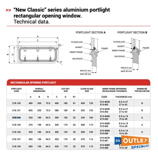 The Nemo opening porthole, model number 218.144, is designed to provide a combination of functionality and aesthetics for any boat or yacht. This porthole offers a clear view of the outside world while simultaneously ensuring ventilation and lighting in the interior. Features: Dimensions: A sleek and streamlined design with dimensions of 155 x 405 mm, perfect for a wide range of marine applications. Quality Material: Made from high-quality materials that withstand the harsh marine environment, ensuring durability and a long lifespan. Easy Installation: Supplied with all necessary mounting hardware and a clear manual, making installation quick and straightforward. Weatherproof: Equipped with a robust seal that helps prevent water and moisture from entering, keeping your boat or yacht dry at all times. Adjustable Opening: The adjustable opening mechanism allows you to easily control the amount of light and air that comes in. Aesthetic Design: A sleek and modern design that not only offers functionality but also adds style to your boat or yacht. Applications: Ideal for sailing boats, yachts, motorboats, and other marine applications where visibility, ventilation, and light are important. In the package: 1 x Nemo Opening Porthole 155 x 405 mm (Model 218.144) Mounting hardware Installation manual Conclusion: The Nemo Opening Porthole 218.144 is a must-have for any boat or yacht owner looking for a combination of functionality and aesthetics. It not only provides clarity and ventilation in your boat or yacht but also adds a touch of style. Order today and experience the quality and convenience of this premium product.