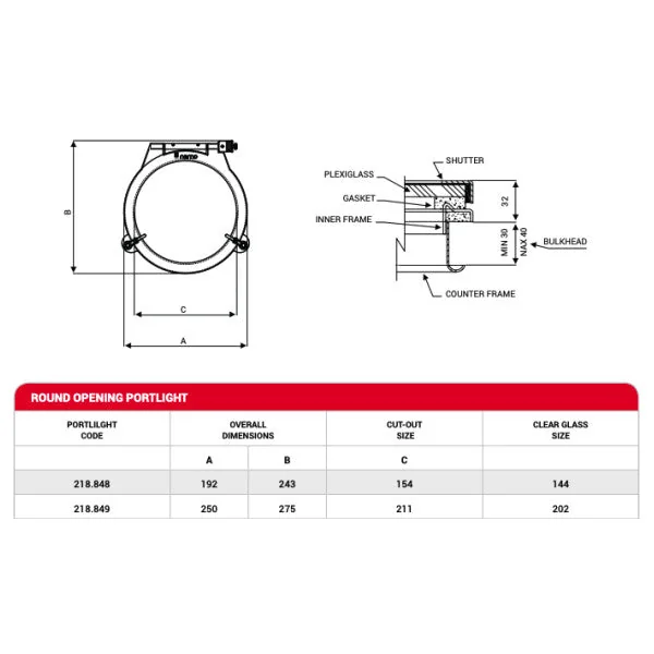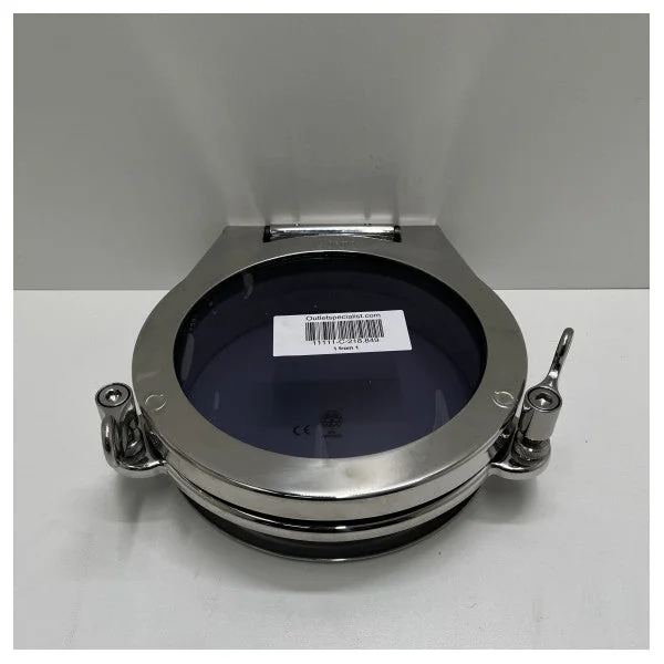 Nemo stainless steel porthole opening with a diameter of 211 mm.