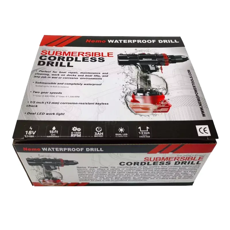 The Nemo Waterproof Drill was designed for the worker or boater who needs a portable electric drill when working in wet conditions or underwater. The Waterproof Drill may be used in salt, fresh, or chlorinated water up to 16 feet (5 meters) deep.