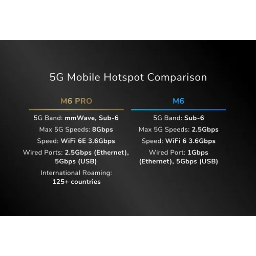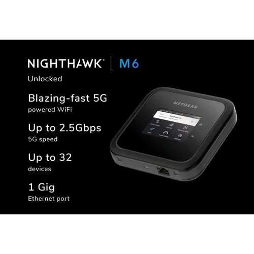 Unlocked for ultimate flexibilityGet the freedom to select the carrier of your choice, or switch carriers in seconds with a simple SIM card swap.Fast, reliable WiFi anywhere you goStream videos, work online, host Zoom calls, and more, all at once. With M6, you can keep the whole family happy with fast, secure WiFi everywhere.Keep sensitive data secureUsing public WiFi networks puts your private data at risk. With M6, you can use your own secure WiFi network anywhere with no worries.Superior performance vs. a mobile phone hotspotGet exponentially more speed and connectivity than a mobile phone hotspot and stop draining your battery.Use 5G WiFi for your home or businessM6 is powerful enough to be a primary or backup internet connection for your home or business. Always stay connected and protected, even during broadband outages.Double your WiFi coverageRemove M6’s battery and use the power adapter to boost WiFi coverage and performance for your home or business.Ultra-fast and reliable wired connectionsWhen you need incredible speed and reliability, Nighthawk delivers. Blaze through your most important tasks with wired speeds up to 5Gbps over USB-C and 1Gbps over Ethernet.All-day powerNighthawk M6 offers a powerful battery with up to 13-hours of battery life††, so you can rely on it for even the most challenging days, without worry.