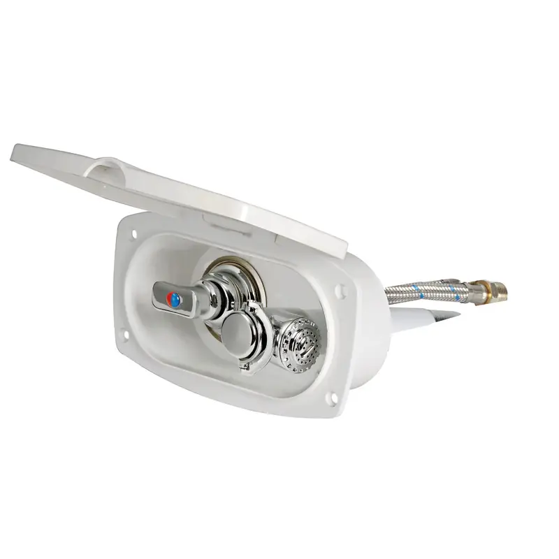 Efficient rear shower box with a cream PVC hose for hot/cold water mixing, perfect for marine use.